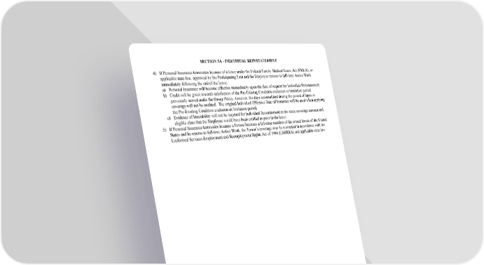SECTION 5A - INDIVIDUAL REINSTATEMENT 4) If Personal Insurance terminates because of a leave under the Federal Family Medical Leave Act (FMLA), or applicable state law, approved by the Participating Unit and the Employee returns to full-time Active Work immediately following the end of the leave: a) Personal Insurance will become effective immediately upon the date of request for Individual Reinstatement. b) Credit will be given towards satisfaction of the Pre-Existing Condition exclusion or limitation period previously served under the Group Policy, however, the days accumulated during the period of lapse in coverage will not be credited. The original Individual Effective Date of Insurance will be used when applying the Pre-Existing Condition exclusion or limitation period. c) Evidence of Insurability will not be required for Individual Reinstatement to the same coverage amount and eligible class that the Employee would have been entitled to prior to the leave. 5) If Personal Insurance terminates because a Person becomes a full-time member of the armed forces of the United States and he returns to full-time Active Work, the Person’s coverage may be reinstated in accordance with the Uniformed Services Employment and Reemployment Rights Act of 1994 (USERRA) and applicable state law. GC 3100.13-1/1A SECTION 5A - INDIVIDUAL REINSTATEMENT 2005