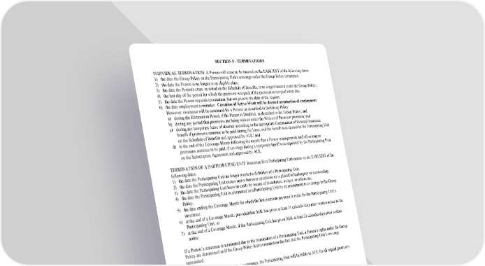 SECTION 5 - TERMINATIONS INDIVIDUAL TERMINATION: A Person will cease to be insured on the EARLIEST of the following dates: 1) the date the Group Policy or the Participating Unit's coverage under the Group Policy terminates; 2) the date the Person is no longer in an eligible class; 3) the date the Person's class, as stated on the Schedule of Benefits, is no longer insured under the Group Policy; 4) the last day of the period for which the premium was paid, if the premium is not paid when due; 5) the date the Person requests termination, but not prior to the date of the request; 6) the date employment terminates. Cessation of Active Work will be deemed termination of employment. However, insurance will be continued for a Person, as described in the Group Policy: a) during the Elimination Period, if the Person is Disabled, as described in the Group Policy; and b) during any period that premiums are being waived under the Waiver of Premium provision; and c) during any temporary leave of absence according to the appropriate Continuation of Personal Insurance benefit if premiums continue to be paid during the leave, and the benefit was elected by the Participating Unit on the Schedule of Benefits and approved by AUL; and d) to the end of the Coverage Month following the month that a Person is temporarily laid off as long as premiums continue to be paid, if coverage during a temporary layoff was requested by the Participating Unit on the Subscription Agreement and approved by AUL. TERMINATION OF A PARTICIPATING UNIT: Insurance for a Participating Unit ceases on the EARLIEST of the following dates: 1) the date the Participating Unit no longer meets the definition of a Participating Unit; 2) the date the Participating Unit ceases active business operations or is placed in bankruptcy or receivership; 3) the date the Participating Unit loses its entity by means of dissolution, merger, or otherwise; 4) the date the Participating Unit is eliminated as a Participating Unit by an amendment to or change in the Group Policy; 5) the date ending the Coverage Month for which the last premium payment is made for the Participating Unit’s insurance; 6) at the end of a Coverage Month, provided that AUL has given at least 31 calendar days prior written notice to the Participating Unit; or 7) at the end of a Coverage Month, if the Participating Unit has given AUL at least 31 calendar days prior written notice. If a Person’s insurance is terminated due to the termination of a Participating Unit, a Person’s rights under the Group Policy are determined as if the Group Policy had terminated on the date that the Participating Unit’s coverage terminated. If coverage for a Participating Unit terminates, the Participating Unit will be liable to AUL for all unpaid premiums for the period during which the coverage was in force. GC 3100.12C SECTION 5 - TERMINATIONS 2005 (FMLA Inc/Layoff Inc) (LOA Inc/Military Inc)