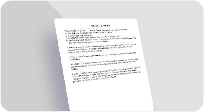 SECTION 2 - DEFINITIONS TOTAL DISABILITY and TOTALLY DISABLED mean that because of Injury or Sickness a Person is: 1) under the Regular Attendance of a Physician for that Injury or Sickness; 2) is not working in any occupation; and 3) cannot perform the Material and Substantial Duties of his Regular Occupation; and 4) after benefits have been paid for two (2) years, a Person cannot perform the duties of any Gainful Occupation that he is reasonably fitted for by training, education or experience. If the Person is employed as a pilot, co-pilot, or crew of an aircraft, Total Disability and Totally Disabled mean that because of Injury or Sickness, a Person cannot perform the duties of any Gainful Occupation for which he is reasonably fitted by training, education or experience. If a Person's Regular Occupation requires a license, loss of this license for any reason does not in itself constitute Total Disability. TREATMENT FREEmeans the Person has not received medical treatment, consultation, care or services including diagnostic measures, and the Person has not taken or been prescribed drugs or medicines for the Pre-existing Condition. WAITING PERIOD means the period of days, starting on the Date Of Hire, that an Employee must be continuously Actively at Work while in an eligible class. Initial Employees will be given credit for time served under the Participating Unit’s prior carrier if the Group Policy replaced the same type of coverage an Employee had with the prior carrier. The Waiting Period is stated in the Schedule of Benefits. GC 3100.9D SECTION 2 - DEFINITIONS 2018 (Reg Occ/Any Occ/No ADL)