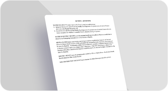 SECTION 2 - DEFINITIONS MAXIMUM CAPACITY means, based on the Person’s restrictions and limitations: 1) during the first two (2) years of receiving Monthly Benefit payments, the greatest extent of work the Person is able to do in his Regular Occupation; and 2) beyond two (2) years of receiving Monthly Benefit payments, the greatest extent of work the Person is able to do in any occupation for which he is reasonably fitted by education, training or experience. MAXIMUM MONTHLY BENEFIT means the maximum benefit amount payable to a Person on a monthly basis as elected by the Participating Unit and shown on the Schedule of Benefits. MENTAL ILLNESS means a psychiatric or psychological condition classified in the Diagnostic and Statistical Manual of Mental Health Disorders (DSM), published by the American Psychiatric Association, most current as of the start of a Disability. Such disorders include, but are not limited to, psychotic, emotional or behavioral disorders, or disorders related to stress or to substance abuse or dependency. If the DSM is discontinued or replaced, these disorders will be those classified in the diagnostic manual then used by the American Psychiatric Association as of the start of a Disability. MONTHLY BENEFIT means the amount payable monthly by AUL to a Disabled Person. It is the Gross Monthly Benefit reduced by Other Income Benefits. NON-CONTRIBUTORY INSURANCE means insurance for which a Person pays none of the premium. GC 3100.5/1 SECTION 2 - DEFINITIONS 2005 (Reg Occ/Any Occ)