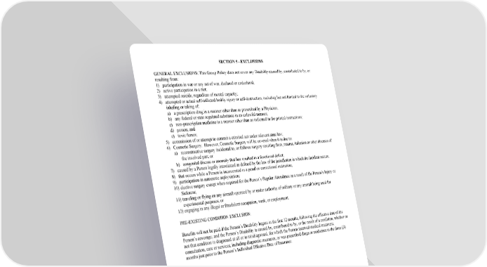 SECTION 9 - EXCLUSIONS GENERAL EXCLUSIONS: This Group Policy does not cover any Disability caused by, contributed to by, or resulting from: 1) participation in war or any act of war, declared or undeclared; 2) active participation in a riot; 3) attempted suicide, regardless of mental capacity; 4) attempted or actual self-inflicted bodily injury or self-destruction, including but not limited to the voluntary inhaling or taking of: a) a prescription drug in a manner other than as prescribed by a Physician; b) any federal or state regulated substance in an unlawful manner; c) non-prescription medicine in a manner other than as indicated in the printed instructions; d) poison; and e) toxic fumes; 5) commission of or attempt to commit a criminal act under relevant state law; 6) Cosmetic Surgery. However, Cosmetic Surgery will be covered when it is due to: a) reconstructive surgery incidental to, or follows surgery resulting from, trauma, infection or other diseases of the involved part; or b) congenital disease or anomaly that has resulted in a functional defect; 7) caused by a Person legally intoxicated as defined by the law of the jurisdiction in which the incident occurs; 8) that occurs while a Person is incarcerated in a penal or correctional institution; 9) participation in autoerotic asphyxiation; 10) elective surgery except when required for the Person’s Regular Attendance as a result of the Person’s Injury or Sickness; 11) traveling or flying on any aircraft operated by or under authority of military or any aircraft being used for experimental purposes; or 12) engaging in any illegal or fraudulent occupation, work, or employment. PRE-EXISTING CONDITION EXCLUSION: Benefits will not be paid if the Person’s Disability begins in the first 12 months, following the effective date of the Person’s coverage; and the Person’s Disability is caused by, contributed to by, or the result of a condition, whether or not that condition is diagnosed at all or is misdiagnosed, for which the Person received medical treatment, consultation, care or services, including diagnostic measures, or was prescribed drugs or medicines in the three (3) months just prior to the Person’s Individual Effective Date of Insurance. GC 3100.27B SECTION 9 - EXCLUSIONS 2005 (3/12) (Prudent: Not Included)