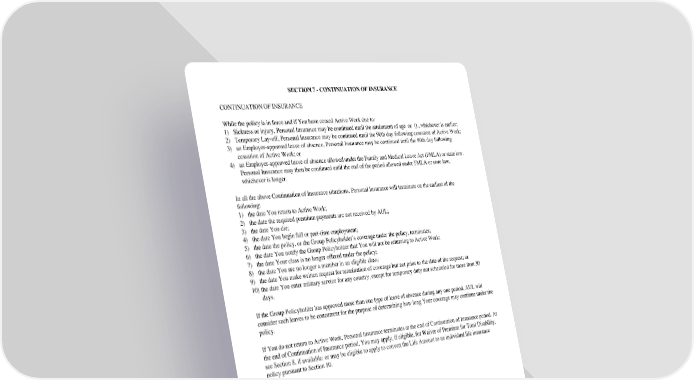 SECTION7-CONTINUATIONOFINSURANCE CONTINUATIONOFINSURANCE Whilethe policy is in force and if You have ceased Active Work due to: 1) Sickness or injury, Personal Insurance may be continued until the attainment of age or () , whichever is earlier; 2) TemporaryLay-off, Personal Insurance may be continued until the 90th day following cessation of Active Work; 3) anEmployer-approvedleaveof absence,Personal Insurance may be continued until the 90th day following cessation of Active Work; or 4) anEmployer-approvedleaveof absenceallowedunder the Family and Medical Leave Act (FMLA) or state law. Personal Insurance may then be continued until the end of the period allowed under FMLA or state law, whichever is longer. In all the above Continuation of Insurance situations, Personal Insurance will terminate on the earliest of the following: 1) the date You return to Active Work; 2) the date the required premium payments are not received by AUL; 3) the date You die; 4) the date You begin full or part-time employment; 5) the date the policy, or the Group Policyholder’s coverage under the policy, terminates; 6) the date You notify the Group Policyholder that You will not be returning to Active Work; 7) the date Your class is no longer offered under the policy; 8) the date You are no longer a member in an eligible class; 9) the date You make written request for termination of coverage but not prior to the date of the request; or 10) the date You enter military service for any country, except for temporary duty not scheduled for more than 30 days. If the Group Policyholder has approved more than one type of leave of absence during any one period, AUL will consider such leaves to be concurrent for the purpose of determining how long Your coverage may continue under the policy. If You do not return to Active Work, Personal Insurance terminates at the end of Continuation of Insurance period. At the end of Continuation of Insurance period, You may apply, if eligible, for Waiver of Premium for Total Disability, see Section 8, if available; or may be eligible to apply to convert the Life Amount to an individual life insurance policy pursuant to Section 10. GC2510.9 SECTION7-CONTINUATIONOFINSURANCE (Waiver: Not Included)