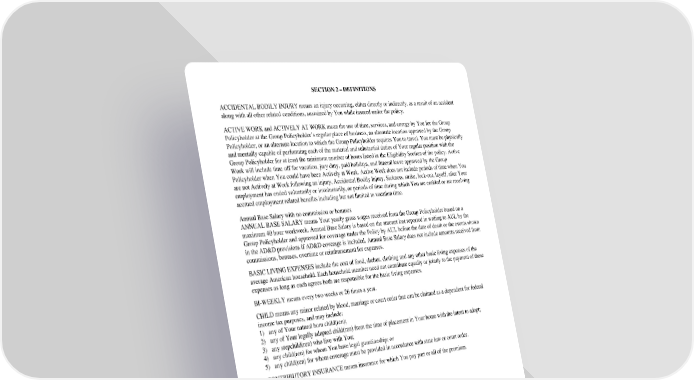 SECTION2–DEFINITIONS ACCIDENTALBODILYINJURYmeansaninjuryoccurring,eitherdirectlyorindirectly,asaresultofanaccident along with all other related conditions, sustained by You while insured under the policy. ACTIVEWORKandACTIVELYATWORKmeantheuseoftime,services,andenergybyYoufortheGroup Policyholder at the Group Policyholder’s regular place of business, an alternate location approved by the Group Policyholder, or an alternate location to which the Group Policyholder requires You to travel. You must be physically and mentally capable of performing each of the material and substantial duties of Your regular position with the GroupPolicyholder for at least the minimum number of hours listed in the Eligibility Section of the policy. Active Workwillincludetime off for vacation, jury duty, paid holidays, and funeral leave approved by the Group Policyholder when You could have been Actively at Work. Active Work does not include periods of time when You are not Actively at Work following an injury, Accidental Bodily Injury, Sickness, strike, lock-out, layoff, after Your employmenthasendedvoluntarily or involuntarily, or periods of time during which You are entitled or are receiving accrued employment related benefits including but not limited to vacation time. AnnualBaseSalarywithnocommissionorbonuses ANNUALBASESALARYmeansYouryearlygrosswagesreceivedfromtheGroupPolicyholderbasedona maximum40hourworkweek.AnnualBaseSalaryisbasedontheamountlastreportedinwritingtoAULbythe GroupPolicyholder and approved for coverage under the Policy by AUL before the date of death or the events shown in the AD&Dprovisions if AD&Dcoverageis included. Annual Base Salary does not include amounts received from commissions, bonuses, overtime or reimbursement for expenses. BASICLIVINGEXPENSESincludethecostoffood,shelter,clothingandanyotherbasiclivingexpensesofthe average American household. Each household member need not contribute equally or jointly to the payment of these expenses as long as each agrees both are responsible for the basic living expenses. BI-WEEKLYmeanseverytwoweeksor26timesayear. CHILDmeansanyminorrelatedbyblood,marriageorcourtorderthatcanbeclaimedasadependentforfederal incometax purposes, and may include: 1) anyofYournaturalbornchild(ren); 2) anyofYourlegallyadoptedchild(ren) from the time of placement in Your home with the intent to adopt; 3) anystepchild(ren) who live with You; 4) anychild(ren) for whom You have legal guardianship; or 5) anychild(ren) for whom coverage must be provided in accordance with state law or court order. CONTRIBUTORYINSURANCEmeansinsuranceforwhichYoupaypartorallofthepremium. GC2510.3B SECTION2-DEFINITIONS