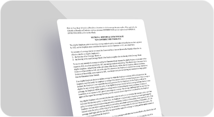 Refer to Your Basic Schedule of Benefits to determine to which coverage this page applies. When applicable, the Schedule of Benefits will indicate employee premium CONTRIBUTIONSare not required and INDIVIDUAL EFFECTIVEDATEisFirstoftheMonth. SECTION4-INDIVIDUALEFFECTIVEDATE NON-CONTRIBUTORYINSURANCE Theeligible Employee, prior to receiving coverage under the policy must make written election on a form approved by AULandtheEmployermustcontributetherequiredamountofpremiumtoAULonatimelybasis. For amounts of coverage that do not exceed the Guaranteed Issue Amount shown in the Schedule of Benefits, the effective date for an eligible Employee is: 1) the first day of the Coverage Month; or 2) the first day of the next Coverage Month if the Employee applies after the first day of the Coverage Month. ToreceiveanyamountofcoverageexceedingtheGuaranteedIssueAmount,theeligibleEmployeemustmakewritten request to AUL on a form approved by AUL and undergo medical underwriting. The effective date of insurance for an eligible Employee, subject to the further provisions of this Section, will be after the Employee submits satisfactory Evidence of Insurability to AUL and on the date AUL determines the Employee is approved for coverage. Satisfactory Evidence of Insurability, at no expense to AUL, must be provided prior to receiving any amount of coverage greater than the Guaranteed Issue Amount. If an eligible Employee desires to decline coverage for which the Employer would pay 100% of the premium, the Employeemustfirst notify the Employer in writing of this decision prior to coverage being declined. Once coverage is declined, the Employer is not responsible for paying premium for that Employee, and the Employee will not be eligible for any coverage under the policy. If an eligible Employee initially declines coverage and later desires to have coverage, the Employee will be required to undergo medical underwriting and submit satisfactory Evidence of Insurability at no expense to AUL prior to receiving any coverage. No coverage shall begin until the date AUL has approved the request for coverage in writing and the required amount of premium is received from the Employer. Anyeligible Employee who converted his insurance under the policy to an individual life insurance policy and if that individual life insurance policy is still in force, the Employee is required prior to becoming insured again under the policy to undergo medical underwriting and submit satisfactory Evidence of Insurability, at no expense to AUL. If the EmployeedoesnotwishtoundergomedicalunderwritingandsubmitsatisfactoryEvidenceof Insurability, the Life Amountunderthepolicywillbereducedbytheamountofcoverageundertheindividuallifeinsurancepolicy. No coverage shall begin until the date AUL has approved the request for coverage in writing and the required amount of premiumisreceivedfrom the Employer. If an Employee is not Actively at Work on the date coverage would otherwise become effective, the effective date will be: 1) the first day of the Coverage Month, if the Eligible Employee returns to Active Work on the first day of the CoverageMonth;or 2) the first day of the Coverage Month following the date the eligible Employee returns to Active Work, if Active Workbeginsafter the first day of the Coverage Month. Contributions for Basic insurance are not required from Employees for Personal Insurance. Also see Continuity of Coverage, Section 5, if included in the policy. GC2510.5 SECTION4-INDIVIDUALEFFECTIVEDATE (First of Month) NON-CONTRIBUTORYINSURANCE