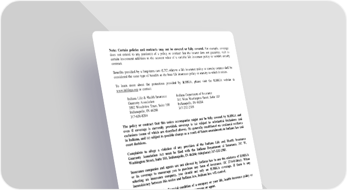 Note: Certain policies and contracts may not be covered or fully covered. For example, coverage does not extend to any portion(s) of a policy or contract that the insurer does not guarantee, such as certain investment additions to the account value of a variable life insurance policy or variable annuity contract. Benefits provided by a long-term care (LTC) rider to a life insurance policy or annuity contract shall be considered the same type of benefits as the base life insurance policy or annuity to which it relates. To learn more about the protections provided by ILHIGA, please visit the ILHIGA website at www.inlifega.org or contact: Indiana Life & Health Insurance Indiana Department of Insurance Guaranty Association 311 West Washington Street, Suite 103 3502 Woodview Trace, Suite 100 Indianapolis, IN 46204 Indianapolis, IN 46268 317-232-2385 317-636-8204 The policy or contract that this notice accompanies might not be fully covered by ILHIGA and even if coverage is currently provided, coverage is (a) subject to substantial limitations and exclusions (some of which are described above), (b) generally conditioned on continued residence in Indiana, and (c) subject to possible change as a result of future amendments to Indiana law and court decisions. Complaints to allege a violation of any provision of the Indiana Life and Health Insurance Guaranty Association Act must be filed with the Indiana Department of Insurance, 311 W. Washington Street, Suite 103, Indianapolis, IN 46204; (telephone) 317-232-2385. Insurance companies and agents are not allowed by Indiana law to use the existence of ILHIGA or its coverage to encourage you to purchase any form of insurance. (IC 27-8-8-18(a)). When selecting an insurance company, you should not rely on ILHIGA coverage. If there is any inconsistency between this notice and Indiana law, Indiana law will control. Questions regarding the financial condition of a company or your life, health insurance policy or annuity should be directed to your insurance company or agent. G-IN Rev. 07-19