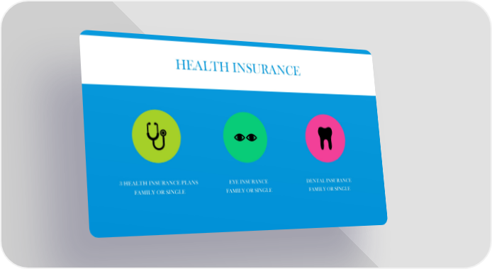 HEALTH INSURANCE 3 HEALTH INSURANCE PLANS FAMILY OR SINGLE EYE INSURANCE FAMILY OR SINGLE DENTAL INSURANCE FAMILY OR SINGLE