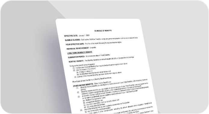 SCHEDULE OF BENEFITS EFFECTIVE DATE: January 1, 2023 ELIGIBLE CLASSES: Each active, Full-time Teacher, except any person employed on a temporary or seasonal basis. YOUR EFFECTIVE DATE: The first of the month following the day you become eligible. INDIVIDUAL REINSTATEMENT: 6 months LONG TERM DISABILITY BENEFIT ELIMINATION PERIOD: 90 consecutive days of Total Disability. MONTHLY BENEFIT: The Monthly Benefit is an amount equal to 66 2/3% of Covered Monthly Earnings. To figure this benefit amount payable: (1) multiply your Covered Monthly Earnings by the benefit percentage(s) shown above; (2) take the lesser of the amount: (a) of step (1) above; or (b) the Maximum Monthly Benefit shown below; and (3) subtract Other Income Benefits, as shown below, from step (2), above. We will pay at least the Minimum Monthly Benefit as follows. OTHER INCOME BENEFITS: Other Income Benefits are: (1) disability income benefits you are eligible to receive because of your Total Disability under any group insurance plan(s); (2) disability income benefits you are eligible to receive because of your Total Disability under any governmental retirement system, except benefits payable under a federal government employee pension benefit; (3) all benefits (except medical or death benefits) including any settlement made in place of such benefits (whether or not liability is admitted) you are eligible to receive because of your Total disability under: (a) Workers' Compensation Laws; (b) occupational disease law; (c) any other laws of like intent as (a) or (b) above; and (d) any compulsory benefit law; (4) any of the following that you are eligible to receive from the Policyholder: (a) any formal salary continuance plan; (b) wages, salary or other compensation, excluding the amount allowable when engaged in Rehabilitative Employment; and (c) commissions or monies, including vested renewal commissions, but, excluding commissions or monies that you earned prior to Total Disability which are paid after Total Disability has begun; (5) that part of disability benefits paid for by the Policyholder which you are eligible to receive because of your Total disability under a group retirement plan; and (6) that part of Retirement Benefits paid for by the Policyholder which you are eligible to receive under a group retirement plan; and (7) disability or Retirement Benefits under the United States Social Security Act, the Canadian pension plans, or any other government plan for which: (a) you are eligible to receive because of your Total Disability or eligibility for Retirement Benefits; and (b) your dependents are eligible to receive due to (a) above. Disability and early Retirement Benefits will be offset only if such benefits are elected by you or if election would not reduce the amount of your accrued normal Retirement Benefits then funded. Retirement Benefits under number (7) above will not apply to disabilities which begin after age 70 if you are already receiving Social Security Retirement Benefits while continuing to work beyond age 70. MINIMUM MONTHLY BENEFIT: In no event will the Monthly Benefit payable to you be less than $100. LRS-6570-1-0406 Page 1.0