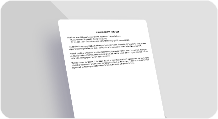 SURVIVOR BENEFIT - LUMP SUM We will pay a benefit to your Survivor when we receive proof that you died while: (1) you were receiving Monthly Benefits from us; and (2) you were Totally Disabled for at least one hundred and eighty (180) consecutive days. The benefit will be an amount equal to 3 times your last Monthly Benefit. The last Monthly Benefit is the benefit you were eligible to receive right before your death. It is not reduced by wages earned while in Rehabilitative Employment. A benefit payable to a minor may be paid to the minor’s legally appointed guardian. If there is no guardian, at our option, we may pay the benefit to an adult that has, in our opinion, assumed the custody and main support of the minor. We will not be liable for any payment we have made in good faith. "Survivor" means your spouse. If the spouse dies before you or if you were legally separated, then your natural, legally adopted or step-children, who are under age twenty-five (25) will be the Survivors. If there are no eligible Survivors, payment will be made to your estate, unless a beneficiary is on record with us under the Policy. LRS-6570-10 Ed. 1/00 Page 11.0