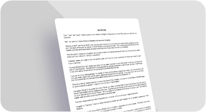 DEFINITIONS "You", "your" and "yours" means a person who meets the Eligibility Requirements of the Policy and is enrolled for this insurance. "We", "us" and "our" means Reliance Standard Life Insurance Company. "Actively at Work" and "Active Work" mean actually performing on a Full-time basis the material duties pertaining to your job in the place where and the manner in which the job is normally performed. This includes approved time off such as vacation, jury duty and funeral leave, but does not include time off as a result of an Injury or Sickness. "Any Occupation" means an occupation normally performed in the national economy for which you are reasonably suited based upon your education, training or experience. "Claimant" means you made a claim for benefits under the Policy for a loss covered by the Policy as a result of your Injury or Sickness. "Covered Monthly Earnings" means your basic monthly salary received from the Policyholder on the day just before the date of Total Disability. Covered Monthly Earnings does not include commissions, overtime pay, bonuses, incentive pay or any other special compensation not received as Covered Monthly Earnings. If you are an hourly paid employee, the number of hours worked during a regular work week, not to exceed forty (40) hours per week, times 4.333, will be used to determine Covered Monthly Earnings. If you are paid on an annual basis, then the Covered Monthly Earnings will be determined by dividing the basic annual salary by 12. "Elimination Period" means a period of consecutive days of Total Disability, as shown on the Schedule of Benefits page, for which no benefit is payable. It begins on the first day of Total Disability. Interruption Period: If, during the Elimination Period, you return to Active Work for less than 30 days, then the same or related Total Disability will be treated as continuous. Days that you are Actively at Work during this interruption period will not count towards the Elimination Period. This interruption of the Elimination Period will not apply to you if you become eligible under any other group long term disability insurance plan. "Full-time" means working for the Policyholder for a minimum of 8 hours during your regular work week. "Hospital" or "Institution" means a facility licensed to provide care and Treatment for the condition causing your Total Disability. "Injury" means bodily Injury resulting directly from an accident, independent of all other causes. The Injury must cause Total Disability which begins while your insurance coverage is in effect. "Physician" means a duly licensed practitioner who is recognized by the law of the state in which treatment is received as qualified to treat the type of Injury or Sickness for which a claim is made. The Physician may not be you or a member of your immediate family. "Regular Care" means Treatment that is administered as frequently as is medically required according to guidelines established by nationally recognized authorities, medical research, healthcare organizations, governmental agencies or rehabilitative organizations. Care must be rendered personally by your Physician according to generally accepted medical standards in your locality, be of a demonstrable medical value and be necessary to meet your basic health needs. "Regular Occupation" means the occupation you are routinely performing when Total Disability begins. We will look at your occupation as it is normally performed in the national economy, and not the unique duties performed for a specific employer or in a specific locale. LRS-6570-2-0406 Page 2.0