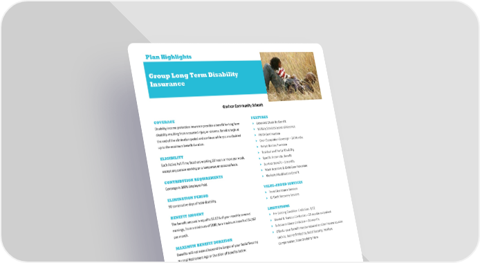 Plan Highlights Group Long Term Disability Insurance Goshen Community Schools COVERAGE FEATURES Disability income protection insurance provides a benefit for long term Extended Disability Benefit disability resulting from a covered injury or sickness. Benefits begin at Military Services Leave of Absence the end of the elimination period and continue while you are disabled FMLA Continuation up to the maximum benefit duration. Own Occupation Coverage – 24 Months Rehabilitation Provision ELIGIBILITY Residual and Partial Disability Each Active Full-Time Teachers working 20 hours or more per week, Specific Indemnity Benefit except any person working on a temporary or seasonal basis. Survivor Benefit – 3 months CONTRIBUTION REQUIREMENTS Work Incentive & Child Care Provisions Coverage is 100% Employer Paid. Worksite Modification Benefit ELIMINATION PERIOD VALUE-ADDED SERVICES 90 consecutive days of total disability. Travel Assistance Services ID Theft Recovery Services BENEFIT AMOUNT The benefit amount is equal to 66.67% of your monthly covered LIMITATIONS earnings, from a minimum of $100, to a maximum benefit of $4,167 Pre-Existing Condition Limitation: 3/12 per month. Mental & Nervous Limitation – 24 months outpatient Substance Abuse Limitation – 24 months MAXIMUM BENEFIT DURATION Offsets: your benefit may be reduced by other income sources Benefits will not extend beyond the longer of your Social Security such as, but not limited to, Social Security, Workers Normal Retirement Age or Duration of Benefits below: Compensation, State Disability Plans Age at Disablement Duration of Benefits 61 or less To Age 65 62 3 1/2 Years 63 3 Years 64 2 1/2 Years 65 2 Years 66 1 3/4 Years 67 1 1/2 Years 68 1 1/4 Years 69 or more 1 Year www.reliancestandard.com This Plan Highlight is not a complete description of the insurance coverage. Insurance is provided under group policy form LRS-6564, et al. This is not a binding contract. Should there be a difference between this Plan Highlight and the contract, the contract will govern. The Certificate of Coverage will be made available to you that describes the benefits in greater detail; however a benefit will not be paid if caused or contributed by an exclusion listed in the Certificate. Reliance Standard Life Insurance Company is licensed in all states (except New York), the District of Columbia, Puerto Rico, the U.S. Virgin Islands and Guam. In New York, insurance products and services are provided through First Reliance Standard Life Insurance Company, Home Office: New York, NY. Product features and availability may vary by state.