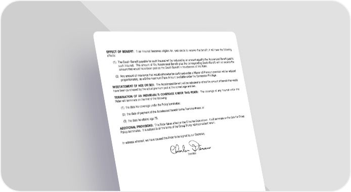 EFFECT OF BENEFIT: If an Insured becomes eligible for, and elects to receive this benefit, it will have the following effects: (1) The Death Benefit payable for such Insured will be reduced by an amount equal to the Accelerated Benefit paid to such Insured. The amount of the Accelerated Benefit plus the corresponding Death Benefit will not exceed the amount that would have been paid as the Death Benefit in the absence of this Rider. (2) Any amount of insurance that would otherwise be continued under a Waiver of Premium provision will be reduced proportionately, as will the maximum Face Amount available under the Conversion Privilege. MISSTATEMENT OF AGE OR SEX: The Accelerated Benefit will be adjusted to reflect the amount of benefit that would have been purchased by the actual premium paid at the correct age and sex. TERMINATION OF AN INDIVIDUAL’S COVERAGE UNDER THIS RIDER: The coverage of any Insured under this Rider will terminate on the first of the following: (1) the date his coverage under the Policy terminates; (2) the date of payment of the Accelerated Benefit for his Terminal Illness; or (3) the date he attains age 75. ADDITIONAL PROVISIONS: This Rider takes effect on the Effective Date shown. It will terminate on the date the Group Policy terminates. It is subject to all the terms of the Group Policy not inconsistent herein. In witness whereof, we have caused this Rider to be signed by our Secretary. Secretary LRS-8596-001-0690 F Page 17.1