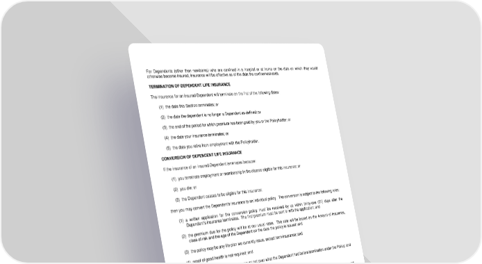 For Dependents (other than newborns) who are confined in a hospital or at home on the date on which they would otherwise become insured, insurance will be effective as of the date the confinement ends. TERMINATION OF DEPENDENT LIFE INSURANCE The insurance for an insured Dependent will terminate on the first of the following dates: (1) the date this Section terminates; or (2) the date the dependent is no longer a Dependent as defined; or (3) the end of the period for which premium has been paid by you or the Policyholder; or (4) the date your insurance terminates; or (5) the date you retire from employment with the Policyholder. CONVERSION OF DEPENDENT LIFE INSURANCE If the insurance of an insured Dependent terminates because: (1) you terminate employment or membership in the classes eligible for this insurance; or (2) you die; or (3) the Dependent ceases to be eligible for this insurance; then you may convert the Dependent's insurance to an individual policy. The conversion is subject to the following rules: (1) a written application for the conversion policy must be received by us within thirty-one (31) days after the Dependent's insurance terminates. The first premium must be sent in with the application; and (2) the premium due for the policy will be at our usual rates. This rate will be based on the Amount of Insurance, class of risk and the age of the Dependent on the date the policy is issued; and (3) the policy may be any life plan we currently issue, except term insurance; and (4) proof of good health is not required; and (5) the policy issued will be for an amount not over what the Dependent had before termination under the Policy; and (6) the policy issued will not have disability or supplemental benefits. If the Dependent's insurance ceases due to termination or amendment of the Policy, an individual policy can be issued. The Dependent must have been insured for at least five (5) years under the Policy and/or the prior carrier. The same rules as shown in the previous paragraph will be used, except that the face amount will be the lesser of: (1) the amount of Dependent life insurance under the Policy. This amount will be less any amount of group life insurance the Dependent receives or becomes eligible for within thirty-one (31) days after the Policy terminates; or (2) $10,000. If an insured Dependent should die within thirty-one (31) days of the date his/her insurance ceased, we will pay the benefit he/she had under the Policy. This will be done whether or not you applied for the individual policy on behalf of the insured Dependent. LRS-6423-31 Ed. 04/16 Page 14.1