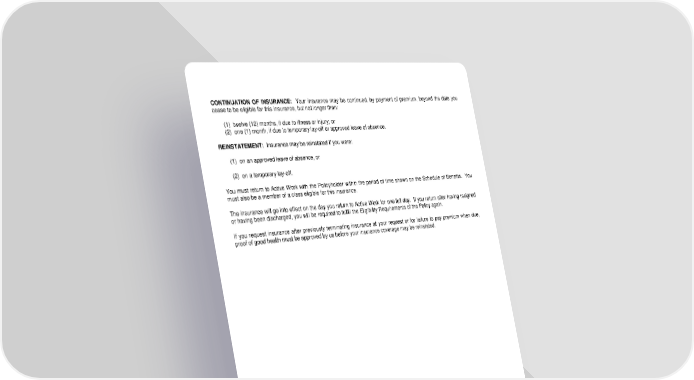 CONTINUATION OF INSURANCE: Your insurance may be continued, by payment of premium, beyond the date you cease to be eligible for this insurance, but not longer than: (1) twelve (12) months, if due to illness or injury; or (2) one (1) month, if due to temporary lay-off or approved leave of absence. REINSTATEMENT: Insurance may be reinstated if you were: (1) on an approved leave of absence, or (2) on a temporary lay-off. You must return to Active Work with the Policyholder within the period of time shown on the Schedule of Benefits. You must also be a member of a class eligible for this insurance. The insurance will go into effect on the day you return to Active Work for one full day. If you return after having resigned or having been discharged, you will be required to fulfill the Eligibility Requirements of the Policy again. If you request insurance after previously terminating insurance at your request or for failure to pay premium when due, proof of good health must be approved by us before your insurance coverage may be reinstated. LRS-6423-4 Ed. 04/16 Page 5.1