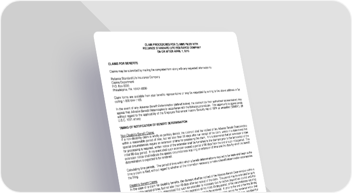 CLAIM PROCEDURES FOR CLAIMS FILED WITH RELIANCE STANDARD LIFE INSURANCE COMPANY ON OR AFTER APRIL 1, 2018 CLAIMS FOR BENEFITS Claims may be submitted by mailing the completed form along with any requested information to: Reliance Standard Life Insurance Company Claims Department P.O. Box 8330 Philadelphia, PA 19101-8330 Claim forms are available from your benefits representative or may be requested by writing to the above address or by calling 1-800-644-1103. In the event of any Adverse Benefit Determination (defined below), the claimant (or their authorized representative) may appeal that Adverse Benefit Determination in accordance with the following procedures. This opportunity to appeal exists without regard to the applicability of the Employee Retirement Income Security Act of 1974 as amended (“ERISA”), 29 U.S.C. 1001 et seq. TIMING OF NOTIFICATION OF BENEFIT DETERMINATION Non-Disability Benefit Claims If a non-disability claim is wholly or partially denied, the claimant shall be notified of the Adverse Benefit Determination within a reasonable period of time, but not later than 90 days after our receipt of the claim, unless it is determined that special circumstances require an extension of time for processing the claim. If it is determined that an extension of time for processing is required, written notice of the extension shall be furnished to the claimant prior to the termination of the initial 90-day period. In no event shall such extension exceed a period of 90 days from the end of such initial period. The extension notice shall indicate the special circumstances requiring an extension of time and the date by which the benefit determination is expected to be rendered. Calculating time periods. The period of time within which a benefit determination is required to be made shall begin at the time a claim is filed, without regard to whether all the information necessary to make a benefit determination accompanies the filing. Disability Benefit Claims In the case of a claim for disability benefits, the claimant shall be notified of the Adverse Benefit Determination within a reasonable period of time, but not later than 45 days after our receipt of the claim. This period may be extended for up to 30 days, provided that it is determined that such an extension is necessary due to matters beyond our control and that notification is provided to the claimant, prior to the expiration of the initial 45-day period, of the circumstances requiring the extension of time and the date by which a decision is expected to be rendered. If, prior to the end of the first 30-day extension period, it is determined that, due to matters beyond our control, a decision cannot be rendered within that extension period, the period for making the determination may be extended for up to an additional 30 days, provided that the claimant is notified, prior to the expiration of the first 30-day extension period, of the circumstances requiring the extension and the date by which a decision is expected to be rendered. In the case of any such extension, the notice of extension shall specifically explain the standards on which entitlement to a benefit is based, the unresolved issues that prevent a decision on the claim, and the additional information needed to resolve those issues, and the claimant shall be afforded at least 45 days within which to provide the specified information. Calculating time periods. The period of time within which a benefit determination is required to be made shall begin at the time a claim is filed, without regard to whether all the information necessary to make a benefit determination accompanies the filing. In the event that a period of time is extended due to a claimant’s failure to submit information necessary to decide a claim, the period for making the benefit determination shall be tolled from the date on which the notification of the extension is sent to the claimant until the date on which the claimant responds to the request for additional information.
