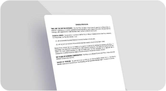 GENERAL PROVISIONS TIME LIMIT ON CERTAIN DEFENSES: After the Policy has been in force for two (2) years from its Effective Date, no statement made by you on a written application for insurance shall be used to reduce or deny a claim after your insurance coverage, with respect to which claim has been made, has been in effect for two (2) years. CLERICAL ERROR: Clerical errors in connection with the Policy or delays in keeping records for the Policy, whether by the Policyholder, the Plan Administrator, or us: (1) will not terminate insurance that would otherwise have been effective; and (2) will not continue insurance that would otherwise have ceased or should not have been in effect. Clerical Errors include (but are not limited to) the payment of premium for coverage not provided by the Policy. If appropriate, a fair adjustment of premium will be made to correct a clerical error. Such adjustments will be limited to the twelve (12) month period preceding the date we receive proof from the Policyholder that an adjustment due to overpayment of premium should be made or the date we discover that premium has been underpaid. NOT IN LIEU OF WORKERS' COMPENSATION: The Policy is not a Workers' Compensation Policy. It does not provide Workers' Compensation benefits. WAIVER OF PREMIUM: No premium is due us while you are receiving Monthly Benefits from us. Once Monthly Benefits cease due to the end of your Total Disability, premium payments must begin again if insurance is to continue. LRS-6570-3-0516 Page 4.0
