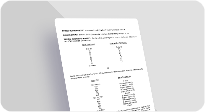 MINIMUM MONTHLY BENEFIT: In no event will the Monthly Benefit payable to you be less than $100. MAXIMUM MONTHLY BENEFIT: $2,780 (this is equal to a maximum Covered Monthly Earnings of $4,170). MAXIMUM DURATION OF BENEFITS: Benefits will not accrue beyond the longer of: the Duration of Benefits; or Normal Retirement Age; specified below: Age at Disablement Duration of Benefits (in years) 61 or less To Age 65 62 3 ½ 63 3 64 2 ½ 65 2 66 1 ¾ 67 1 ½ 68 1 ¼ 69 or more 1 OR Normal Retirement Age as defined by the 1983 Amendments to the United States Social Security Act and determined by your year of birth, as follows: Year of Birth Normal Retirement Age 1937 or before 65 years 1938 65 years and 2 months 1939 65 years and 4 months 1940 65 years and 6 months 1941 65 years and 8 months 1942 65 years and 10 months 1943 thru 1954 66 years 1955 66 years and 2 months 1956 66 years and 4 months 1957 66 years and 6 months 1958 66 years and 8 months 1959 66 years and 10 months 1960 and after 67 years CHANGES IN MONTHLY BENEFIT: Increases in the Monthly Benefit are effective on the date of the change, provided you are Actively at Work on the effective date of the change. If you are not Actively at Work on that date, the effective date of the increase in the benefit amount will be deferred until the date you return to Active Work. Decreases in the Monthly Benefit are effective on the date the change occurs. CONTRIBUTIONS: You are not required to contribute toward the cost of this insurance. Premium contributions will not be included in your gross income. For purposes of filing your Federal Income Tax Return, this means that under the law as of the date the Policy was issued, your Monthly Benefit might be treated as taxable. It is recommended that you contact your personal tax advisor. LRS-6570-1-0406 Page 1.1