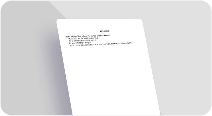 EXCLUSIONS We will not pay a Monthly Benefit for any Total Disability caused by: (1) an act of war, declared or undeclared; or (2) an intentionally self-inflicted Injury; or (3) your committing a felony; or (4) an Injury or Sickness that occurs while you are confined in any penal or correctional institution. LRS-6570-7-1189 Page 8.0