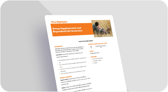 Plan Highlights Group Supplemental and Dependent Life Insurance Goshen Community Schools ELIGIBILITY BENEFIT REDUCTION DUE TO AGE Each Active Full-Time Certified Personnel, Full-Time Directors and Age Original Benefit Reduced to Board Members working 30 hours or more per week, except for 70 50% any person working on a temporary or seasonal basis. Dependents: You must be insured for your Dependents to be RATES covered. Dependents are: See attached Rate Sheet  Your legal spouse who is not legally separated or divorced from FEATURES you;  Accelerated Death Benefit  Your unmarried financially dependent children age birth to 26  FMLA/MSLA Extension years;  Portability  A person may not have coverage as both an Employee and Dependent;  Only one insured spouse may cover dependent children. BENEFIT AMOUNT Supplemental Life: Choose from a minimum of $10,000 to a maximum of $500,000 in $10,000 increments, not to exceed 5 times annual earnings. Spouse: Choose from a minimum of $5,000, a maximum of $250,000 in $5,000 increments, not to exceed 100% of employee amount. Child(ren): Birth to age 26 years: $2,000 to $10,000 in increments of $2,000. GUARANTEED ISSUE Initial eligibility period only Employee: $200,000 Spouse: $25,000 Child(ren): $10,000 CONTRIBUTION REQUIREMENTS Coverage is 100% Employee Paid. www.reliancestandard.com This Plan Highlight is not a complete description of the insurance coverage. Insurance is provided under group policy form LRS-6422, et al. This is not a binding contract. Should there be a difference between this Plan Highlight and the contract, the contract will govern. The Certificate of Coverage will be made available to you that describes the benefits in greater detail; however a benefit will not be paid if caused or contributed by an exclusion listed in the Certificate. Reliance Standard Life Insurance Company is licensed in all states (except New York), the District of Columbia, Puerto Rico, the U.S. Virgin Islands and Guam. In New York, insurance products and services are provided through First Reliance Standard Life Insurance Company, Home Office: New York, NY. Product features and availability may vary by state.