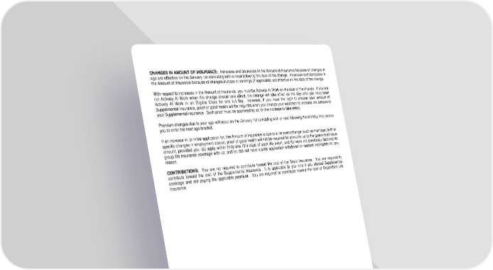 CHANGES IN AMOUNT OF INSURANCE: Increases and decreases in the Amount of Insurance because of changes in age are effective on the January 1st coinciding with or next following the date of the change. Increases and decreases in the Amount of Insurance because of changes in class or earnings (if applicable) are effective on the date of the change. With respect to increases in the Amount of Insurance, you must be Actively At Work on the date of the change. If you are not Actively At Work when the change should take effect, the change will take effect on the day after you have been Actively At Work in an Eligible Class for one full day. However, if you have the right to choose your amount of Supplemental insurance, proof of good health will be required when you change your selection to increase the amount of your Supplemental insurance. Such proof must be approved by us for the increase to take effect. Premium changes due to your age will occur on the January 1st coinciding with or next following the birthday that causes you to enter the next age bracket. If an increase in, or initial application for, the Amount of Insurance is due to a life event change (such as marriage, birth or specific changes in employment status), proof of good health will not be required for amounts up to the guaranteed issue amount, provided you: (a) apply within thirty-one (31) days of such life event; and (b) were not previously declined for group life insurance coverage with us; and (c) did not have a prior application withdrawn or marked incomplete for any reason. CONTRIBUTIONS: You are not required to contribute toward the cost of the Basic Insurance. You are required to contribute toward the cost of the Supplemental Insurance. It is applicable to you only if you elected Supplemental coverage and are paying the applicable premium. You are required to contribute toward the cost of Dependent Life Insurance. LRS-6423-1 Ed. 04/16 Page 1.1