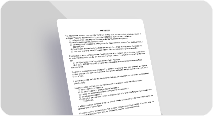 PORTABILITY You may continue insurance coverage under the Policy if coverage would otherwise terminate because you cease to be an Eligible Person, for reasons other than the termination of the Policy, or your retirement, provided you: (1) notify us in writing within thirty-one (31) days from the date you cease to be eligible; and (2) remit the necessary premiums when due; and (3) are not approved for extension of coverage under the Waiver of Premium in Event of Total Disability provision, if applicable; and (4) have not been terminated under the Waiver of Premium in Event of Total Disability provision, if applicable; and (5) have been covered for twelve (12) months under the Policy and/or the prior group life insurance policy. The amount of coverage available under the Portability provision will be the current amount of coverage you are insured for under the Policy on the last day you were Actively at Work. However, the amount of coverage will never be more than: (1) the highest amount of life insurance available to Eligible Persons; or (2) a total of $500,000 from all RSL group life and accidental death and dismemberment insurance combined, whichever is less. The premium charged to continue coverage will be based on the prevailing rate charged to Insureds who choose to continue coverage under the Portability provision. Such premium will be billed directly to you on a quarterly, semi-annual or annual basis. If your coverage under the Policy includes Accidental Death and Dismemberment, then such benefits may be continued under the Policy. Insurance coverage continued under this provision for you will terminate on the first of the following to occur: (1) the date the Policy terminates; or (2) the end of the period for which premium has been paid; or (3) the date you are covered under another group term life insurance policy; or (4) the date you reach age 65; or (5) at any time coverage would normally terminate according to the terms of the Policy had you continued to be an Eligible Person. In addition, coverage will reduce at any time it would normally reduce according to the terms of the Policy had you continued to be an Eligible Person. If insurance coverage terminates due to (1) or (4) above, it may be converted to an individual life insurance policy. The conversion will be subject to the terms and conditions set forth under the Conversion Privilege. LRS-6423-83 Ed. 07/05 Page 16.0