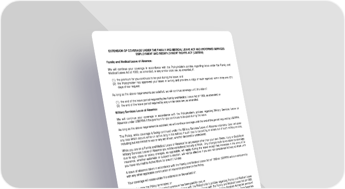 EXTENSION OF COVERAGE UNDER THE FAMILY AND MEDICAL LEAVE ACT AND UNIFORMED SERVICES EMPLOYMENT AND REEMPLOYMENT RIGHTS ACT (USERRA) Family and Medical Leave of Absence: We will continue your coverage in accordance with the Policyholder's policies regarding leave under the Family and Medical Leave Act of 1993, as amended, or any similar state law, as amended, if: (1) the premium for you continues to be paid during the leave; and (2) the Policyholder has approved your leave in writing and provides a copy of such approval within thirty-one (31) days of our request. As long as the above requirements are satisfied, we will continue coverage until the later of: (1) the end of the leave period required by the Family and Medical Leave Act of 1993, as amended; or (2) the end of the leave period required by any similar state law, as amended. Military Services Leave of Absence: We will continue your coverage in accordance with the Policyholder's policies regarding Military Services Leave of Absence under USERRA if the premium for you continues to be paid during the leave. As long as the above requirement is satisfied, we will continue coverage until the end of the period required by USERRA. The Policy, while coverage is being continued under the Military Services Leave of Absence extension, does not cover any loss which occurs while on active duty in the military if such loss is caused by or arises out of such military service, including but not limited to war or any act of war, whether declared or undeclared. While you are on a Family and Medical Leave of Absence for any reason other than your own illness, injury or disability or Military Services Leave of Absence you will be considered Actively at Work. Any changes such as revisions to coverage due to age, class or salary changes, as applicable, will apply during the leave except that increases in the amount of insurance, whether automatic or subject to election, will not be effective if you are not considered Actively at Work until you have returned to Active Work for one (1) full day. A leave of absence taken in accordance with the Family and Medical Leave Act of 1993 or USERRA will run concurrently with any other applicable continuation of insurance provision in the Policy. Your coverage will cease under this extension on the earliest of: (1) the date the Policy terminates; or (2) the end of the period for which premium has been paid for you; or (3) the date such leave should end in accordance with the Policyholder's policies regarding Family and Medical Leave of Absence and Military Services Leave of Absence in compliance with the Family and Medical Leave Act of 1993, as amended and USERRA. Coverage will not be terminated if you become Totally Disabled during the period of the leave and are eligible for benefits according to the terms of the Policy. Any Monthly Benefit which becomes payable will be based on your Covered Monthly Earnings immediately prior to the date of Total Disability. Should the Policyholder choose not to continue your coverage during a Family and Medical Leave of Absence and/or Military Services Leave of Absence, your coverage will be reinstated. LRS-6570-74-0708 Page 13.0