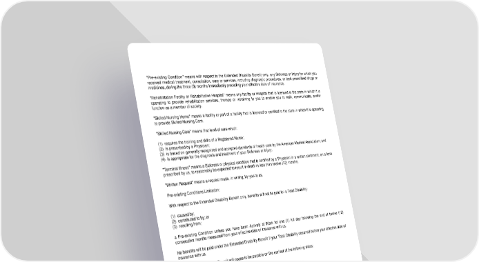 "Pre-existing Condition" means with respect to the Extended Disability Benefit only, any Sickness or Injury for which you received medical treatment, consultation, care or services, including diagnostic procedures, or took prescribed drugs or medicines, during the three (3) months immediately preceding your effective date of insurance. "Rehabilitation Facility or Rehabilitative Hospital" means any facility or Hospital that is licensed in the state in which it is operating to provide rehabilitation services, therapy or retraining to you to enable you to walk, communicate, and/or function as a member of society. "Skilled Nursing Home" means a facility or part of a facility that is licensed or certified in the state in which it is operating to provide Skilled Nursing Care. "Skilled Nursing Care" means that level of care which: (1) requires the training and skills of a Registered Nurse; (2) is prescribed by a Physician; (3) is based on generally recognized and accepted standards of health care by the American Medical Association; and (4) is appropriate for the diagnosis and treatment of your Sickness or Injury. "Terminal Illness" means a Sickness or physical condition that is certified by a Physician in a written statement, on a form prescribed by us, to reasonably be expected to result in death in less than twelve (12) months. "Written Request" means a request made, in writing, by you to us. Pre-existing Conditions Limitation: With respect to the Extended Disability Benefit only, benefits will not be paid for a Total Disability: (1) caused by; (2) contributed to by; or (3) resulting from; a Pre-existing Condition unless you have been Actively at Work for one (1) full day following the end of twelve (12) consecutive months measured from your effective date of insurance with us. No benefits will be paid under the Extended Disability Benefit if your Total Disability occurred before your effective date of insurance with us. The Extended Disability Benefit will cease to be payable on the earliest of the following dates: (1) the date you die; or (2) the date you no longer meet the requirements of Total Disability of the Policy; or (3) the date you: (a) are no longer confined as an Inpatient in a Skilled Nursing Home, Rehabilitative Facility or Rehabilitation Hospital; or (b) are no longer receiving Home Health Care or Hospice Care; or (4) the date you are no longer considered Cognitively Impaired; or (5) the date you are no longer unable to perform at least two Activities of Daily Living (ADL); or (6) the date you receive your 60th monthly Extended Disability Benefit payment. The Extended Disability Benefit will not be payable for Total Disability which is caused by or results from conditions for which Monthly Benefits are specifically limited by the Policy such as Mental or Nervous Disorders, alcoholism, drug addiction, or other Substance Abuse, musculoskeletal and connective tissue disorders, chronic fatigue syndrome, Environmental Allergic or Reactive Illness, or Self-Reported Conditions. LRS-6570-199-0501 Page 14.1