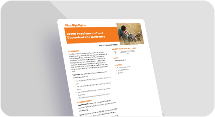 Plan Highlights Group Supplemental and Dependent Life Insurance Goshen Community Schools ELIGIBILITY BENEFIT REDUCTION DUE TO AGE Each Active Full-Time Non Certified Personnel of the Employer Age Original Benefit Reduced to regularly working a minimum of 20 hours per week who were hired 70 50% prior to January 1, 2012 and all Active Full-Time Non Certified Personnel of the Employer regularly working a minimum of 30 RATES hours per week who were hired after January 1, 2012 as well as See attached Rate Sheet Bus Drivers of the Employer regularly working a minimum of 16 hours per week during the school year working 20 hours or more FEATURES per week, except any person working on a temporary or seasonal basis. Accelerated Death Benefit Dependents: You must be insured for your Dependents to be FMLA/MSLA Extension covered. Dependents are: Portability Your legal spouse who is not legally separated or divorced from you; Your unmarried financially dependent children age birth to 26 years; A person may not have coverage as both an Employee and Dependent; Only one insured spouse may cover dependent children. BENEFIT AMOUNT Supplemental Life: Choose from a minimum of $10,000 to a maximum of $500,000 in $10,000 increments, not to exceed 5 times annual earnings. Spouse: Choose from a minimum of $5,000, a maximum of $250,000 in $5,000 increments, not to exceed 100% of employee amount. Child(ren): Birth to age 26 years: $2,000 to $10,000 in increments of $2,000. GUARANTEED ISSUE Initial eligibility period only Employee: $200,000 Spouse: $25,000 Child(ren): $10,000 CONTRIBUTION REQUIREMENTS Coverage is 100% Employee Paid. www.reliancestandard.com This Plan Highlight is not a complete description of the insurance coverage. Insurance is provided under group policy form LRS-6422, et al. This is not a binding contract. Should there be a difference between this Plan Highlight and the contract, the contract will govern. The Certificate of Coverage will be made available to you that describes the benefits in greater detail; however a benefit will not be paid if caused or contributed by an exclusion listed in the Certificate. Reliance Standard Life Insurance Company is licensed in all states (except New York), the District of Columbia, Puerto Rico, the U.S. Virgin Islands and Guam. In New York, insurance products and services are provided through First Reliance Standard Life Insurance Company, Home Office: New York, NY. Product features and availability may vary by state.