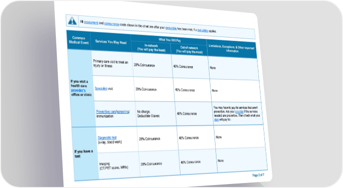 All copayment and coinsurance costs shown in this chart are after your deductible has been met, if a deductible applies. Common What You Will Pay Limitations, Exceptions, & Other Important Medical Event Services You May Need In-network Out-of-network Information (You will pay the least) (You will pay the most) Primary care visit to treat an 20% Coinsurance 40% Coinsurance None injury or illness If you visit a health care Specialist visit 20% Coinsurance 40% Coinsurance None provider’s office or clinic You may have to pay for services that aren't Preventive care/screening/ No charge; 40% Coinsurance preventive. Ask your provider if the services immunization Deductible Waived needed are preventive. Then check what your plan will pay for. Diagnostic test 20% Coinsurance 40% Coinsurance None (x-ray, blood work) If you have a test Imaging 20% Coinsurance 40% Coinsurance None (CT/PET scans, MRIs) Page 2 of 7