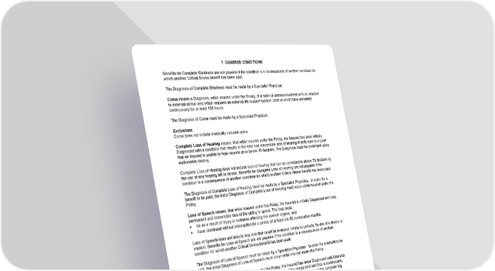 7. COVERED CONDITIONS Benefits for Complete Blindness are not payable if the condition is a consequence of another condition for which another Critical Illness benefit has been paid. The Diagnosis of Complete Blindness must be made by a Specialist Physician. Coma means a Diagnosis, while insured under the Policy, of a state of unconsciousness with no reaction to external stimuli and which requires an external life support system, both of which have persisted continuously for at least 168 hours. The Diagnosis of Coma must be made by a Specialist Physician. Exclusions: Coma does not include medically induced coma. Complete Loss of Hearing means, that while insured under the Policy, the Insured has been initially Diagnosed with a condition that results in the total and irreversible loss of hearing in both ears to a point that an Insured is unable to hear sounds at or below 70 decibels. The Diagnosis must be confirmed using audiometric testing. Complete Loss of Hearing does not include loss of hearing that can be corrected to above 70 decibels by the use of any hearing aid or device. Benefits for Complete Loss of Hearing are not payable if the condition is a consequence of another condition for which another Critical Illness benefit has been paid. The Diagnosis of Complete Loss of Hearing must be made by a Specialist Physician. In order for a benefit to be paid, the initial Diagnosis of Complete Loss of Hearing must occur while insured under the Policy. Loss of Speech means, that while insured under the Policy, the Insured is initially Diagnosed with total, permanent and irreversible loss of the ability to speak. The loss must: · be as a result of Injury or sickness affecting the speech organs; and · have continued without interruption for a period of at least six (6) consecutive months. Loss of Speech does not include any loss that could be restored, totally or partially, by use of a device or implant. Benefits for Loss of Speech are not payable if the condition is a consequence of another condition for which another Critical Illness benefit has been paid. The Diagnosis of Loss of Speech must be made by a Specialist Physician. In order for a benefit to be paid, the initial Diagnosis of Loss of Speech must occur while insured under the Policy. Paralysis means, that while insured under the Policy, the Insured has been Diagnosed with total and irreversible loss of use of two or more limbs due to Injury of the spinal cord and that is continuously present for a period of at least 180 days. Limb is defined as the complete arm or the complete leg. The Diagnosis of Paralysis must be made by a Specialist Physician and shall not include any impairment caused by a Stroke or other sickness. Severe Burns means, that while insured under the Policy, the Insured is initially Diagnosed with third- degree burns over at least 18% of the body surface. Severe Burns must occur while the Insured’s insurance is in force to be eligible for a benefit. The Diagnosis of Severe Burns must be made by a Specialist Physician. CHILDHOOD CONDITIONS CATEGORY The following covered childhood conditions apply only to children who meet the definition of Dependent Children and are insured under this Certificate: Cerebral Palsy means a Diagnosis of nonprogressive, neurological defect affecting muscle control resulting from an Injury to or congenital abnormality. The initial Diagnosis of Cerebral Palsy must be made 16-SD-C-01 Page24