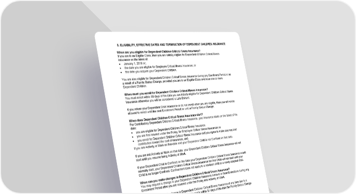 5. ELIGIBILITY, EFFECTIVE DATES AND TERMINATION OF DEPENDENT CHILDREN INSURANCE When are you eligible for Dependent Children Critical Illness Insurance? If you are in an Eligible Class, then you are initially eligible for Dependent Children Critical Illness Insurance on the latest of: · January 1, 2019 or; · the date you are eligible for Employee Critical Illness Insurance; or · the date you acquire your Dependent Children. You are also eligible for Dependent Children Critical Illness Insurance during any Enrollment Period or as a result of a Family Status Change, provided you are in an Eligible Class and have one or more Dependent Children. When must you enroll for Dependent Children Critical Illness Insurance? You must enroll within 90 days of the date you are initially eligible for Dependent Children Critical Illness Insurance otherwise you will be considered a Late Entrant. If you refuse your Dependent Child insurance or do not enroll when you are eligible, then you will not be allowed to enroll until the next Enrollment Period or until a Family Status Change. When does Dependent Children Critical Illness Insurance start? For Contributory Dependent Children Critical Illness Insurance, your insurance starts on the latest of the date: · you are eligible for Dependent Children Critical Illness Insurance; · you are first insured under the Policy, for Employee Critical Illness Insurance; or · you enroll for Dependent Children Critical Illness Insurance and you agree to make any required contribution toward the cost of insurance, and if you are Actively at Work on that date and your Dependent Child is not Confined on that date. If you are not Actively at Work on that date, your Dependent Children Critical Illness Insurance will not start until you resume being Actively at Work. If your Dependent Child is Confined on the date your Dependent Children Critical Illness Insurance would normally start, your Dependent Children Critical Illness Insurance for that Child will not start until your Child is no longer Confined. Confinement does not apply to a newborn child or a newly adopted child. When can you make changes in Dependent Children Critical Illness Insurance? You may request a change in your Dependent Children Insurance Amount or benefit elections during any Enrollment Period after you are covered under the Policy and Actively at Work. You may also request a change in Dependent Children Critical Illness Insurance at any time due to a Family Status Change. Such request must be made within 31 days of the date the Family Status Change occurred. Any amount or increase in Dependent Children Critical Illness Insurance is subject to the Pre-existing Conditions limitation. A pre-existing condition will be considered to have occurred in relation to the effective date of the change, not the original effective date of your coverage. You may only increase or decrease your Dependent Children Insurance Amount within the limits shown in the Benefit Highlights. When does a change in Dependent Children Critical Illness Insurance start? If you are Actively at Work, any increase in Dependent Children Critical Illness Insurance or benefits, for reasons other than a Family Status Change, will start on the January 1st following the date of change, when you apply for a different coverage option and you agree to make any required contribution toward the cost of insurance. Your Dependent Child must not be Confined on the date of the increase in benefits. 16-SD-C-01 Page16