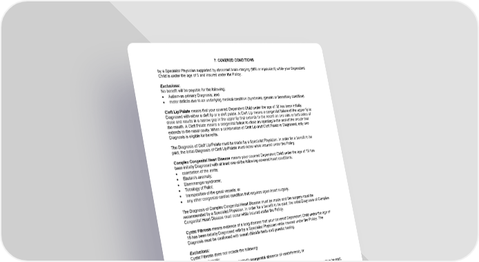 7. COVERED CONDITIONS by a Specialist Physician supported by abnormal brain imaging (MRI or equivalent) while your Dependent Child is under the age of 5 and insured under the Policy. Exclusions: No benefit will be payable for the following: · Autism-as primary Diagnosis; and · motor deficits due to an underlying medical condition (syndrome, genetic or hereditary condition). Cleft Lip/Palate means that your covered Dependent Child under the age of 18 has been initially Diagnosed with either a cleft lip or a cleft palate. A Cleft Lip means a congenital failure of the upper lip to close and results in a narrow gap in the upper lip that extends to the nostril on one side or both sides of the mouth. A Cleft Palate means a congenital failure to close an opening in the roof of the mouth that extends to the nasal cavity. When a combination of Cleft Lip and Cleft Palate is Diagnosed, only one Diagnosis is eligible for benefits. The Diagnosis of Cleft Lip/Palate must be made by a Specialist Physician. In order for a benefit to be paid, the initial Diagnosis of Cleft Lip/Palate must occur while insured under the Policy. Complex Congenital Heart Disease means your covered Dependent Child under the age of 18 has been initially Diagnosed with at least one of the following covered heart conditions: · coarctation of the aorta; · Ebstein's anomaly; · Eisenmenger syndrome; · Tetralogy of Fallot; · transposition of the great vessels; or · any other congenital cardiac condition that requires open heart surgery. The Diagnosis of Complex Congenital Heart Disease must be made and the surgery must be recommended by a Specialist Physician. In order for a benefit to be paid, the initial Diagnosis of Complex Congenital Heart Disease must occur while insured under the Policy. Cystic Fibrosis means evidence of a lung disease that your covered Dependent Child under the age of 18 has been initially Diagnosed with by a Specialist Physician while insured under the Policy. The Diagnosis must be confirmed with sweat chloride tests and genetic testing. Exclusions: Cystic Fibrosis does not include the following: · asymptomatic; · clinical features limited to CABVD (congenital absence of vasdeferens); or · gastrointestinal issues. The Diagnosis of Cystic Fibrosis must be made by a Specialist Physician. In order for a benefit to be paid, the initial Diagnosis of Cystic Fibrosis must occur while insured under the Policy. Type 1 Diabetes Mellitus means that your covered Dependent Child under the age of 18 has been initially Diagnosed with a chronic autoimmune, genetic or infectious destruction of the insulin producing cells in the pancreas and that requires continuous, lifelong insulin therapy. The Diagnosis of Type 1 Diabetes Mellitus must be made by a Specialist Physician. In order for a benefit to be paid, the initial Diagnosis of Type 1 Diabetes Mellitus must occur while insured under the Policy. Down Syndrome means that your covered Dependent Child under the age of 18 has been initially Diagnosed with Down Syndrome by a Specialist Physician. In order for a benefit to be paid, the initial Diagnosis of Down Syndrome must occur while insured under the Policy. 16-SD-C-01 Page25