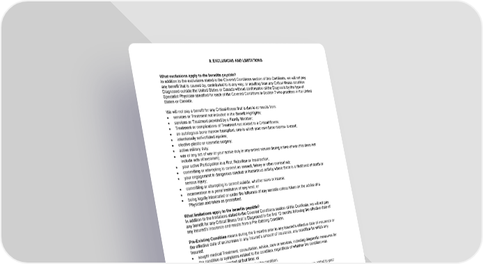 8. EXCLUSIONS AND LIMITATIONS What exclusions apply to the benefits payable? In addition to the exclusions stated in the Covered Conditions section of this Certificate, we will not pay any benefit that is caused by, contributed to in any way, or resulting from any Critical Illness condition Diagnosed outside the United States or Canada without confirmation of the Diagnosis by the type of Specialist Physician specified for each of the Covered Conditions in Section 7 who practices in the United States or Canada. We will not pay a benefit for any Critical Illness that is due to or results from: · services or Treatment not included in the Benefit Highlights; · services or Treatment provided by a Family Member; · Treatment or complications of Treatment not related to a Critical Illness; · an autologous bone marrow transplant, one in which your own bone marrow is used; · intentionally self-inflicted injuries; · elective plastic or cosmetic surgery; · active military duty; · war or any act of war or your active duty in any armed service during a time of war (this does not include acts of terrorism); · your active Participation in a Riot, Rebellion or Insurrection; · committing or attempting to commit an assault, felony or other criminal act; · your engagement in dangerous conduct or hazardous activity where there is a likelihood of death or serious Injury; · committing or attempting to commit suicide, whether sane or insane; · incarceration in a penal institution of any kind; or · being legally Intoxicated or under the influence of any narcotic unless taken on the advice of a Physician and taken as prescribed. What limitations apply to the benefits payable? In addition to the limitations stated in the Covered Conditions section of this Certificate, we will not pay any benefit for any Critical Illness that is Diagnosed in the first 12 months following the effective date of any Insured’s insurance and results from a Pre-Existing Condition. Pre-Existing Condition means during the 6 months prior to any Insured’s effective date of insurance or the effective date of an increase in any Insured’s amount of insurance, any condition for which any Insured: · sought medical Treatment, consultation, advice, care or services, including diagnostic measures for the condition or symptoms related to the condition, regardless of whether the condition was Diagnosed or suspected at that time; or · took prescribed drugs or medicines for the condition. When newborn children, newly placed foster children or newly adopted children are added to your Dependent Children Insurance within 31 days of the birth, placement or adoption, the Pre-Existing Condition limitation does not apply. 16-SD-C-01 Page27