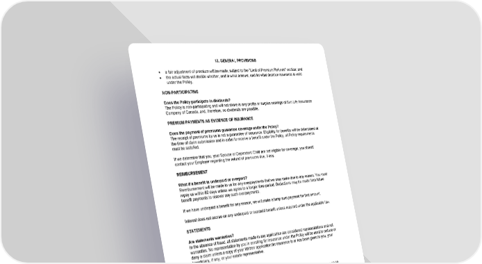 13. GENERAL PROVISIONS · a fair adjustment of premium will be made, subject to the "Limit of Premium Refunds" section; and · the actual facts will decide whether, and in what amount, and for what duration insurance is valid under the Policy. NON-PARTICIPATING Does the Policy participate in dividends? The Policy is non-participating and will not share in any profits or surplus earnings of Sun Life Assurance Company of Canada, and, therefore, no dividends are payable. PREMIUM PAYMENTS AS EVIDENCE OF INSURANCE Does the payment of premiums guarantee coverage under the Policy? The receipt of premiums by us is not a guarantee of insurance. Eligibility for benefits will be determined at the time of claim submission and in order to receive a benefit under the Policy, all Policy requirements must be satisfied. If we determine that you, your Spouse or Dependent Child are not eligible for coverage, you should contact your Employer regarding the refund of premiums due, if any. REIMBURSEMENT What if a benefit is underpaid or overpaid? Reimbursement will be made to us for any overpayments that we may make due to any reason. You must repay us within 60 days unless we agree to a longer time period. Deductions may be made from future benefit payments to recover any such overpayments. If we have underpaid a benefit for any reason, we will make a lump sum payment for that amount. Interest does not accrue on any underpaid or overpaid benefit unless required under the applicable law. STATEMENTS Are statements warranties? In the absence of fraud, all statements made in any application are considered representations and not warranties. No representation by you in enrolling for insurance under the Policy will be used to reduce or deny a claim unless a copy of your Written application for insurance is or has been given to you, your beneficiary, if any, or your estate representative. TIME PERIODS What time periods apply to this Certificate? For the purpose of effective dates and termination dates under this Certificate, all days begin at 12:00 midnight and end at 11:59:59 PM at the Policyholder’s location. 16-SD-C-01 Page39
