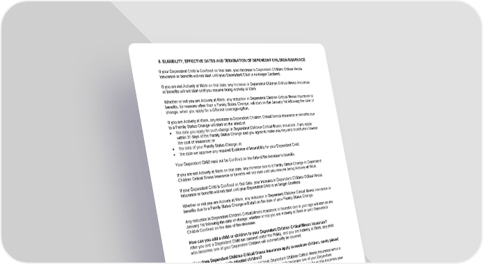 5. ELIGIBILITY, EFFECTIVE DATES AND TERMINATION OF DEPENDENT CHILDREN INSURANCE If your Dependent Child is Confined on that date, your increase in Dependent Children Critical Illness Insurance or benefits will not start until your Dependent Child is no longer Confined. If you are not Actively at Work on that date, any increase in Dependent Children Critical Illness Insurance or benefits will not start until you resume being Actively at Work. Whether or not you are Actively at Work, any reduction in Dependent Children Critical Illness Insurance or benefits, for reasons other than a Family Status Change, will start on the January 1st following the date of change, when you apply for a different coverage option. If you are Actively at Work, any increase in Dependent Children Critical Illness Insurance or benefits due to a Family Status Change will start on the latest of: · the date you apply for such change in Dependent Children Critical Illness Insurance, if you apply within 31 days of the Family Status Change and you agree to make any required contribution toward the cost of insurance; or · the date of your Family Status Change; or · the date we approve any required Evidence of Insurability for your Dependent Child. Your Dependent Child must not be Confined on the date of the increase in benefits. If you are not Actively at Work on that date, any increase due to a Family Status Change in Dependent Children Critical Illness Insurance or benefits will not start until you resume being Actively at Work. If your Dependent Child is Confined on that date, your increase in Dependent Children Critical Illness Insurance or benefits will not start until your Dependent Child is no longer Confined. Whether or not you are Actively at Work, any reduction in Dependent Children Critical Illness Insurance or benefits due to a Family Status Change will start on the date of your Family Status Change. Any reduction in Dependent Children Critical Illness Insurance or benefits due to your age will start on the January 1st following the date of change, whether or not you are Actively at Work or your Dependent Child is Confined on the date of the decrease. How can you add a child or children to your Dependent Children Critical Illness Insurance? After you and a Dependent Child are covered under the Policy, and you are Actively at Work, any child who becomes one of your Dependent Children will automatically be covered. How does Dependent Children Critical Illness Insurance apply to newborn children, newly placed foster children or newly adopted children? If you are insured under the Policy but do not have Dependent Children Critical Illness Insurance when a newborn child, newly placed foster child or newly adopted child becomes one of your Dependent Children, then such child will automatically be covered for 31 days from the date he or she becomes your Dependent Child. To continue coverage beyond 31 days, you must: · enroll for Dependent Children Critical Illness Insurance within 31 days from the date the newborn child, newly placed foster child or newly adopted child becomes your Dependent Child; and · pay the required premium to continue your Dependent Children Critical Illness Insurance. If you are covered under the Policy and have Dependent Children Critical Illness Insurance when a newborn child, newly placed foster child or newly adopted child becomes one of your Dependent Children, then such child will automatically be covered. When does Dependent Children Critical Illness Insurance end? Dependent Children Critical Illness Insurance under the Policy will end on the earliest of the following to occur: 16-SD-C-01 Page17
