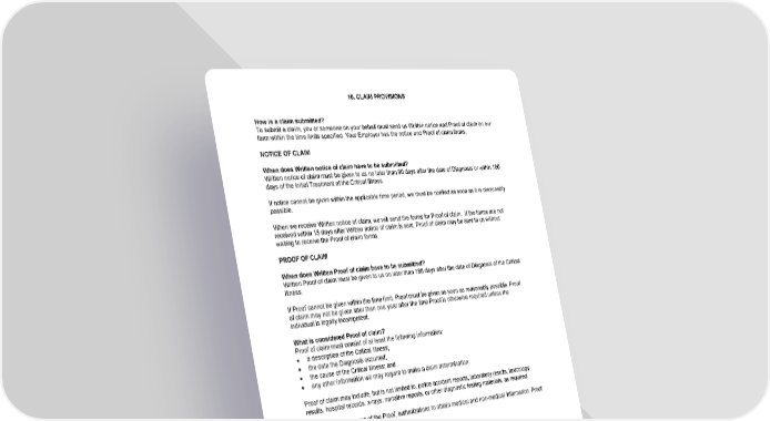 10. CLAIM PROVISIONS How is a claim submitted? To submit a claim, you or someone on your behalf must send us Written notice and Proof of claim on our form within the time limits specified. Your Employer has the notice and Proof of claim forms. NOTICE OF CLAIM When does Written notice of claim have to be submitted? Written notice of claim must be given to us no later than 90 days after the date of Diagnosis or within 180 days of the initial Treatment of the Critical Illness. If notice cannot be given within the applicable time period, we must be notified as soon as it is reasonably possible. When we receive Written notice of claim, we will send the forms for Proof of claim. If the forms are not received within 15 days after Written notice of claim is sent, Proof of claim may be sent to us without waiting to receive the Proof of claim forms. PROOF OF CLAIM When does Written Proof of claim have to be submitted? Written Proof of claim must be given to us no later than 180 days after the date of Diagnosis of the Critical Illness. If Proof cannot be given within the time limit, Proof must be given as soon as reasonably possible. Proof of claim may not be given later than one year after the time Proof is otherwise required unless the individual is legally incompetent. What is considered Proof of claim? Proof of claim must consist of at least the following information: · a description of the Critical Illness; · the date the Diagnosis occurred; · the cause of the Critical Illness; and · any other information we may require to make a claim determination. Proof of claim may include, but is not limited to, police accident reports, laboratory results, toxicology results, hospital records, x-rays, narrative reports, or other diagnostic testing materials, as required. We may require as part of the Proof, authorizations to obtain medical and non-medical information. Proof must be satisfactory to us. PAYMENT OF BENEFITS When are benefits payable? Benefits are payable upon our receipt of satisfactory Proof of claim that establishes benefit eligibility according to the provisions of the Policy. When will a decision on your claim be made? Claims that are not processed promptly will accrue simple interest at the rate required by Indiana law. Under a clean claim, interest will accrue from: · the 46th day we receive first proof of claim in writing; or · the 31st day after we receive the first proof of claim by electronic means. A claim is considered "clean" when the first proof of claim is complete; no part of the claim is contested; and no other defect prevents prompt payment. A claim will also be considered "clean" when we fail to 16-SD-C-01 Page29