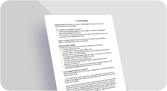 10. CLAIM PROVISIONS promptly request more information or to resolve it, within 45 days after receiving a written claim or 30 days after receiving an electronic claim. Under a defective claim, interest will accrue from: · the 46th day after receipt of enough proof to confirm liability, if the claim is filed in writing and we request more information within 45 days; or · the 31st day after we receive enough proof to confirm liability, if the claim is filed by electronic means and we request more information within 30 days. A claim is considered "defective" when the first proof of claim is incomplete; any part of the claim is contested; or some other defect prevents prompt payment. What if your claim is denied? If we deny all or any part of your claim, you will receive a Written notice of denial stating: · the specific reason(s) for the denial; · the specific Policy provision(s) on which the denial is based; · your right to receive, upon request and free of charge, copies of all documents, records, and other information relevant to your claim for benefits; · a description of any additional material or information needed to prove entitlement to benefits and an explanation of why such material or information is necessary; · a description of the appeal procedures and time limits; · your right to bring a civil action under ERISA, §502(a), if applicable, following an adverse determination on review; and · the identity of any medical or vocational experts whose advice was obtained in connection with the claim, regardless of whether the advice was relied upon to deny the claim. Can you request a review of a claim denial? If all or part of your claim is denied, you may request in Writing a review of the denial within 60 days after receiving notice of denial. You may submit Written comments, documents, records or other information relating to your claim for benefits, and may request free of charge copies of all documents, records, and other information relevant to your claim for benefits. We will review the claim on receipt of the Written request for review, and will complete our review within 20 business days from the date we receive your request and all information needed to complete the review 60 days after the request has been received. If an extension of time is required to process the claim, we will notify you in Writing of the special circumstances requiring the extension and the date by which we expect to make a determination on review. The extension cannot exceed a period of 10 business days from the end of the initial period. We will notify you in writing of our decision within 5 business days after our investigation is complete. If a period of time is extended because you failed to provide information necessary to decide your claim, the period for making the decision on review is tolled from the date we send notice of the extension to you until the date on which you respond to the request for additional information. You will have at least 45 days to provide the specified information. What if your claim is denied on review? If we deny all or any part of your claim on review, you will receive a Written notice of denial stating: · the specific reasons for the denial; · the specific Policy provisions and reasons on which the denial is based; · your right to appeal the decision and information regarding the department or person to contact for information about the decision and your right to appeal; · your right to receive, upon request and free of charge, copies of all documents, records, and other information relevant to your claim for benefits; · your right to bring a civil action under ERISA, §502(a), if applicable; and 16-SD-C-01 Page30