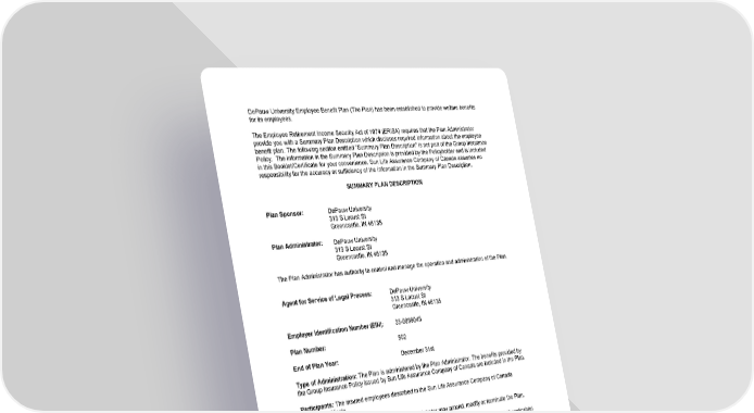 DePauw University Employee Benefit Plan (The Plan) has been established to provide welfare benefits for its employees. The Employee Retirement Income Security Act of 1974 (ERISA) requires that the Plan Administrator provide you with a Summary Plan Description which discloses required information about the employee benefit plan. The following section entitled "Summary Plan Description" is not part of the Group Insurance Policy. The information in the Summary Plan Description is provided by the Policyholder and is included in this Booklet/Certificate for your convenience. Sun Life Assurance Company of Canada assumes no responsibility for the accuracy or sufficiency of the information in the Summary Plan Description. SUMMARY PLAN DESCRIPTION Plan Sponsor: DePauw University 313 S Locust St Greencastle, IN 46135 Plan Administrator: DePauw University 313 S Locust St Greencastle, IN 46135 The Plan Administrator has authority to control and manage the operation and administration of the Plan. Agent for Service of Legal Process: DePauw University 313 S Locust St Greencastle, IN 46135 Employer Identification Number (EIN): 35-0869045 Plan Number: 502 End of Plan Year: December 31st Type of Administration: The Plan is administered by the Plan Administrator. The benefits provided by the Group Insurance Policy issued by Sun Life Assurance Company of Canada are included in the Plan. Participants: The insured employees described in the Sun Life Assurance Company of Canada Booklet/Certificate. Plan Changes and Termination: The Plan Administrator may amend, modify or terminate the Plan. Contributions: The cost of your benefits under the Plan is paid for by your employer and (if applicable) includes the cost of any insurance premiums contributed by you. Funding: Sun Life provides the Plan Administrator with certain insurance benefits in connection with the Plan. Those insurance benefits are described in your Booklet/Certificate. Claims Procedure: When you or your beneficiary wish to file a claim under the Plan, you should contact your personnel office for claim forms and instructions for filing. Your Booklet/Certificate explains the procedure for filing a claim under the Group Insurance Policy. If your claim for benefits is denied in whole or in part, you will receive a written notice within the time required by ERISA from the date you filed your claim, stating the reasons why your claim was denied. You will then have the right, upon written notice from you or your authorized representative, to review that claim denial. The claim denial notice will include the name and address of the person you may ask for
