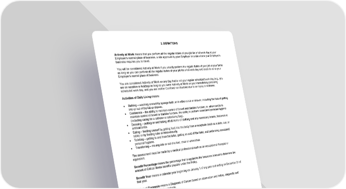 2. DEFINITIONS Actively at Work means that you perform all the regular duties of your job for a full work day at your Employer’s normal place of business, a site approved by your Employer or a site where your Employer’s business requires you to travel. You will be considered Actively at Work if you usually perform the regular duties of your job at your home as long as you can perform all the regular duties of your job for a full work day and could do so at your Employer’s normal place of business. You are considered Actively at Work on any day that is not your regular scheduled work day (e.g., you are on vacation or holiday) as long as you were Actively at Work on your immediately preceding scheduled work day, and you are neither Confined nor disabled due to an Injury or sickness. Activities of Daily Living means: · Bathing – washing oneself by sponge bath; or in either a tub or shower, including the task of getting into or out of the tub or shower. · Continence – the ability to maintain control of bowel and bladder function; or, when unable to maintain control of bowel or bladder function, the ability to perform associated personal hygiene (including caring for a catheter or colostomy bag). · Dressing – putting on and taking off all items of clothing and any necessary braces, fasteners or artificial limbs. · Eating – feeding oneself by getting food into the body from a receptacle (such as a plate, cup, or table) or by feeding tube or intravenously. · Toileting – getting to and from the toilet, getting on and off the toilet, and performing associated personal hygiene. · Transferring – moving into or out of a bed, chair or wheelchair. The assessment must be made by a medical professional such as an occupational therapist or equivalent. Benefit Percentage means the percentage that is applied to the Insurance Amount to determine the amount of Critical Illness benefits payable under the Policy. Benefit Year means a calendar year beginning on January 1 of any year and ending on December 31 of that year. Clinical Diagnosis means a Diagnosis of Cancer based on observation and history, diagnostic and laboratory studies, and symptoms. Confined or Confinement means: · confined to a hospital or similar facility; or · confined at home due to a sickness or Injury and under the care of a Physician. Contributory means you pay all or part of the premium. Coronary Artery Disease means acute coronary occlusion, coronary atherosclerosis, aneurysm and dissection of the coronary arteries or coronary atherosclerosis due to plaque. Critical Illness means only the illnesses defined in the Covered Conditions section of this Certificate for which benefits are payable. Dependent means your insured Spouse and Dependent Children. Dependent Child (Dependent Children) means your unmarried or married child under age 26. Dependent Child includes: 16-SD-C-01 Page8