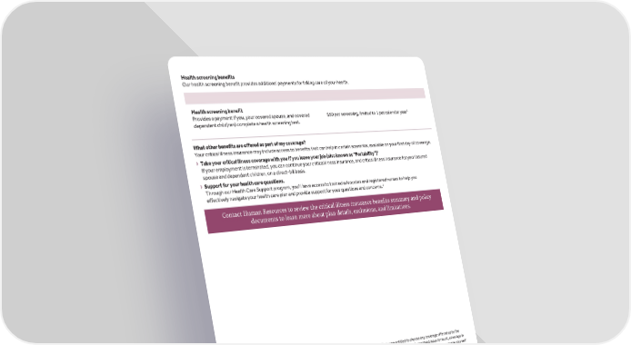Health screening benefits Our health screening benefit provides additional payments for taking care of your health. Health screening benefit 1 Provides a payment if you, your covered spouse, and covered $50 per screening, limited to 1 per calendar year dependent child(ren) complete a health screening test. What other benefits are offered as part of my coverage? Your critical illness insurance may include access to benefits that can help in certain scenarios, available on your first day of coverage. 2 › Take your critical illness coverage with you if you leave your job (also known as “Portability”) If your employment is terminated, you can continue your critical illness insurance, and critical illness insurance for your insured spouse and dependent children, on a direct-bill basis. › Support for your health care questions. Through our Health Care Support program, you’ll have access to trained advocates and registered nurses to help you 3 effectively navigate your health care plan and provide support for your questions and concerns. Contact Human Resources to review the critical illness insurance benefits summary and policy documents to learn more about plan details, exclusions, and limitations. *If you are a new hire and you apply within 31 days after you are eligible to elect coverage for yourself, you are entitled to choose any coverage offered up to the Guaranteed Issue Amount, without providing proof of good health. If you apply for an amount of coverage greater than the Guaranteed Issue Amount, coverage in excess of the Guaranteed Issue Amount will not be issued until the insurance company approves acceptable proof of good health. If you apply for coverage yourself more than 31 days from the date you become eligible to elect coverage under this plan, the Guaranteed Issue Amount will not apply. Coverage will not be issued until the insurance company approves acceptable proof of good health. **Multiple payments – For a covered person to be eligible for more than one benefit payment, the diagnosis is either considered an additional critical illness benefit or a recurrence benefit. Additional critical illness benefit: pays a benefit if the covered person experiences a diagnosis which is a different critical illness from which a benefit was already paid while coverage is in force. Recurrence benefit: pays a benefit if the covered person experiences a subsequent diagnosis which is the same critical illness from which a benefit was already paid, while coverage is in force. For multiple payments to be payable, the separation periods must be met. 1 The benefit is only payable once per day even if multiple Health Screenings are provided in a single day. 2 Portability is referred to as Continuation due to loss of Eligibility in some states. Refer to your certificate. 3 These programs are NOT insurance and do not provide reimbursement for financial losses. Some restrictions may apply. This service is provided exclusively by ® ComPsych Corporation. Customers are required to pay the entire discounted charge for any discounted products or services available through these programs. Some services are available at the option of the employer for an additional cost. Programs are provided through third party vendors who are solely responsible for their products and services. Full terms, conditions and exclusions are contained in the applicable client program description and are subject to change. Program availability may vary by plan type and location and are not available where prohibited by law. Not available for individuals who reside in Washington. Critical illness insurance is a limited benefit policy. This product is not health care insurance and does not satisfy the requirement of minimum essential coverage under the Affordable Care Act. This product is issued by New York Life Insurance and Annuity Corporation (NYLIAC), a subsidiary of New York Life Insurance Company. Policy provisions and product availability may vary by state. Policy form: Critical illness: GBS-CI-1000.00. New York Life Insurance Company 51 Madison Avenue, New York, NY 10010 © 2024, New York Life Insurance Company. All rights reserved. NEW YORK LIFE, and the NEW YORK LIFE Box Logo are trademarks of New York Life Insurance Company. 124126 0524 SMRU 6634422.1 (Exp. 05.23.2026) Elkhart Community Schools SR 67500262-152752337