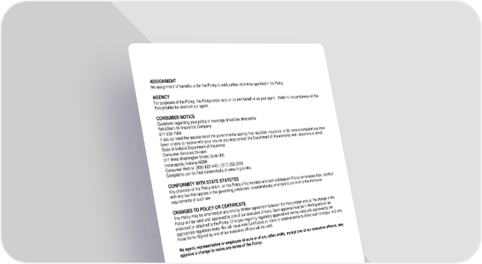 RL-ACC3-CERT2-23-IN 14 D12967 (11/25) ASSIGNMENT No assignment of benefits under the Policy is valid, unless otherwise specified in the Policy. AGENCY For purposes of the Policy, the Policyholder acts on its own behalf or as your agent. Under no circumstances will the Policyholder be deemed our agent. CONSUMER NOTICE Questions regarding your policy or coverage should be directed to: ReliaStar Life Insurance Company 877-236-7564 If you (a) need the assistance of the governmental agency that regulates insurance; or (b) have a complaint you have been unable to resolve with your insurer you may contact the Department of Insurance by mail, telephone or email: State of Indiana Department of Insurance Consumer Services Division 311 West Washington Street, Suite 300 Indianapolis, Indiana 46204 Consumer Hotline: (800) 622-4461; (317) 232-2395 Complaints can be filed electronically at www.in.gov/idoi. CONFORMITY WITH STATE STATUTES Any provision of the Policy which, on the Policy effective date and each subsequent Policy anniversary date, conflicts with any law that applies in the governing jurisdiction, is automatically amended to conform to the minimum requirements of such law. CHANGES TO POLICY OR CERTIFICATE The Policy may be amended at any time by Written agreement between the Policyholder and us. No change in the Policy will be valid until approved by one of our executive officers. Such approval must be in Writing and will be endorsed or attached to the Policy. Changes requiring regulatory approval will not be valid until approved by the appropriate regulatory body. We will issue new Certificates or riders or endorsements to effect such changes, and only those forms Signed by one of our executive officers will be valid. No agent, representative or employee of ours or of any other entity, except one of our executive officers, may approve a change to waive any terms of the Policy.