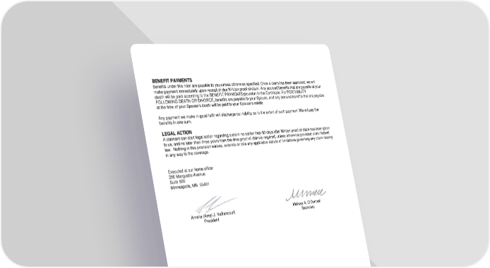 RL-ACC3-WELL2-23-IN 4 WELL-12967 (11/25) BENEFIT PAYMENTS Benefits under this rider are payable to you unless otherwise specified. Once a claim has been approved, we will make payment immediately upon receipt of due Written proof of claim. Any accrued benefits that are payable at your death will be paid according to the BENEFIT PAYMENTS provision in the Certificate. For PORTABILITY FOLLOWING DEATH OR DIVORCE, benefits are payable to your Spouse, and any accrued benefits that are payable at the time of your Spouse’s death will be paid to your Spouse’s estate. Any payment we make in good faith will discharge our liability as to the extent of such payment. We will pay the benefits in one sum. Executed at our home office: 250 Marquette Avenue Suite 900 Minneapolis, MN 55401 Amelia (Amy) J. Vaillancourt Melissa A. O'Donnell President Secretary LEGAL ACTION A claimant can start legal action regarding a claim no earlier than 60 days after Written proof of claim has been given to us, and no later than three years from the time proof of claim is required, unless otherwise provided under federal law. Nothing in this provision waives, extends or tolls any applicable statute of limitations governing any claim relating in any way to the coverage.