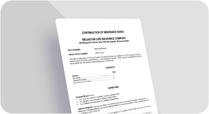 RL-ACC3-CNT2-23-IN 1 CNT-12967 (11/25) DEFINITIONS Covered Person means: You, if you are covered for Accident insurance under the Policy. Your Spouse if covered under the Spouse Accident Rider. Your Children if covered under the Children’s Accident Rider. Leave of Absence means you are absent from Active Employment for a period of time under a leave granted in Writing by the Employer that is in accordance with the Employer’s formal leave policies. Normal vacation time is not considered a Leave of Absence. Labor Strike means you are absent from Active Employment for a period of time for which continuation of insurance is available under the Employer’s Written plan for labor strikes. Temporary Layoff means you are absent from Active Employment and no longer an Employee of the Employer for a limited period of time for which continuation of insurance is available under the Employer’s formal policy for temporary layoffs, and the layoff is not intended to be permanent. Total Disability or Totally Disabled means that due to an injury or sickness you are unable to perform the material duties of your regular occupation, and you are unable to perform any other occupation for which you are fit by education, training or experience. CONTINUATION OF INSURANCE RIDER RELIASTAR LIFE INSURANCE COMPANY 250 Marquette Avenue, Suite 900, Minneapolis, Minnesota 55401 POLICYHOLDER: Noblesville Schools GROUP POLICY NUMBER: 73058-1CAC2 This rider is made a part of the Group Accident Insurance Certificate and is subject to all of the provisions, limitations and exclusions of the Policy and Certificate, unless changed by this rider. Unless expressly changed by this rider, the terms used in this rider have the same meaning as in the Certificate. CONTENTS Section Page Definitions............................................................................. 1 General Provisions................................................................ 2 Continuation of Insurance...................................................... 2