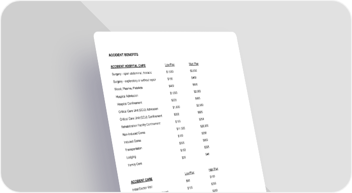 RL-ACC3-CERT2-23-IN 4 D12967 (11/25) ACCIDENT BENEFITS ACCIDENT HOSPITAL CARE Low Plan High Plan Surgery - open abdominal, thoracic $1,000 $2,500 Surgery - exploratory or without repair $150 $400 Blood, Plasma, Platelets $400 $650 Hospital Admission $1,000 $2,000 Hospital Confinement $225 $400 Critical Care Unit (CCU) Admission $1,000 $2,000 Critical Care Unit (CCU) Confinement $350 $600 Rehabilitation Facility Confinement $150 $250 Non-Induced Coma $11,500 $20,000 Induced Coma $100 $250 Transportation $500 $850 Lodging $150 $225 Family Care $20 $40 ACCIDENT CARE Low Plan High Plan Initial Doctor Visit $60 $150 Urgent Care Facility Treatment $150 $300 Emergency Room Treatment $150 $350 Ambulance Ground $250 $600 Air $1,000 $2,500 Follow-Up Doctor Treatment $60 $150 Chiropractic Treatment $30 $75 Medical Equipment $400 $600 Physical or Occupational Therapy $50 $75 Speech Therapy $50 $75