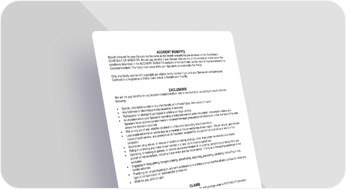 RL-ACC3-SPR2-23-IN 4 SPR-12967 (11/25) CLAIMS A claimant includes you or your Spouse if your Spouse has continued coverage under a PORTABILITY provision. NOTICE OF CLAIM Notice of claim should be given to us within 30 days after the date of loss. The notice may be given to us at our home office or to our authorized administrator. Failure to give notice within this timeframe will not invalidate or reduce any payable claim if it can be shown that it was not reasonably possible to give such notice within that time and the notice was given as soon as reasonably possible. CLAIM FORM The claim form is available from the Employer or can be requested from us. If the form is not received from us within 15 days of the request, Written proof of claim may be sent to us without waiting for the form. If such Written proof of claim covers the occurrence, character and extent of the loss, and is provided within the time period below for proof of claim, the claimant will be deemed to have complied with the requirements for providing proof of claim. FILING A CLAIM The claim form(s) may require completion by the claimant and the Employer and your Spouse’s attending Doctor. The completed form(s) and any attachments indicated on the form(s) as required should be sent directly to us at the address indicated on the form. ACCIDENT BENEFITS Benefit amounts for your Spouse are the same as the benefit amounts for you as shown on the Certificate’s SCHEDULE OF BENEFITS. We will pay benefits if your Spouse receives any of the services or meets any of the conditions described in the ACCIDENT BENEFITS sections of the Certificate, as the result of Injuries received in a Covered Accident. The Injury must occur while your Spouse is covered under the Policy. Only one family care benefit is payable per eligible family member if you and your Spouse are simultaneously Confined in a Hospital or a Critical Care Unit or a Rehabilitation Facility. EXCLUSIONS We will not pay benefits for any Accident-related condition that is contributed to, caused by or results from the following: Suicide, attempted suicide or any intentionally self-inflicted Injury, while sane or insane. Any Sickness or declining process caused by a Sickness. Participation or attempt to participate in a felony or illegal activity. An Accident while your Spouse is operating a motorized vehicle while intoxicated. Intoxication means your Spouse’s blood alcohol content meets or exceeds the legal presumption of intoxication under the laws of the state where the Accident occurred. War or any act of war, whether declared or undeclared (excluding acts of terrorism). Loss sustained while on active duty as a member of the armed forces of any nation. We will refund, upon Written notice of such service, any premium which has been accepted for any period not covered as a result of this exclusion. Alcoholism, drug abuse, or misuse of alcohol or taking of drugs, other than under the direction of a Doctor. Riding in or driving any motor-driven vehicle in a race, stunt show or speed test. Operating, or training to operate, or service as a crew member of, or jumping, parachuting or falling from, any aircraft or hot air balloon, including those which are not motor-driven. Flying as a fare-paying passenger is not excluded. Engaging in hang-gliding, bungee jumping, parachuting, sailgliding, parasailing, parakiting, kitesurfing or any similar activities. Practicing for, or participating in, any semi-professional or professional competitive athletic contests for which any type of compensation or remuneration is received. Work for pay, profit or gain.