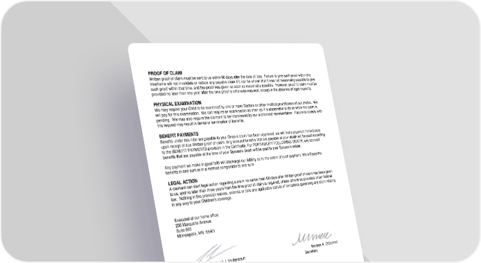 RL-ACC3-CHR2-23-IN 6 CHR-12967 (11/25) PROOF OF CLAIM Written proof of claim must be sent to us within 90 days after the date of loss. Failure to give such proof within this timeframe will not invalidate or reduce any payable claim if it can be shown that it was not reasonably possible to give such proof within that time, and the proof was given as soon as reasonably possible. However, proof of claim must be provided no later than one year after the time proof is otherwise required, except in the absence of legal capacity. PHYSICAL EXAMINATION We may require your Child to be examined by one or more Doctors or other medical practitioners of our choice. We will pay for this examination. We can require an examination as often as it is reasonable to do so while the claim is pending. We may also require the claimant to be interviewed by our authorized representative. Failure to comply with this request may result in denial or termination of benefits. BENEFIT PAYMENTS Benefits under this rider are payable to you. Once a claim has been approved, we will make payment immediately upon receipt of due Written proof of claim. Any accrued benefits that are payable at your death will be paid according to the BENEFIT PAYMENTS provision in the Certificate. For PORTABILITY FOLLOWING DEATH, any accrued benefits that are payable at the time of your Spouse’s death will be paid to your Spouse’s estate. Any payment we make in good faith will discharge our liability as to the extent of such payment. We will pay the benefits in one sum or in a method comparable to one sum. LEGAL ACTION A claimant can start legal action regarding a claim no earlier than 60 days after Written proof of claim has been given to us, and no later than three years from the time proof of claim is required, unless otherwise provided under federal law. Nothing in this provision waives, extends or tolls any applicable statute of limitations governing any claim relating in any way to your Children’s coverage. Executed at our home office: 250 Marquette Avenue Suite 900 Minneapolis, MN 55401 Amelia (Amy) J. Vaillancourt Melissa A. O'Donnell President Secretary