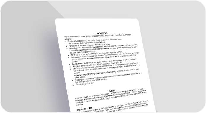 RL-ACC3-ADR2-23-IN 4 ADR-12967 (11/25) CLAIMS A claimant includes you, or in the case of your death, a named Accidental death beneficiary. If there is no named beneficiary, a claimant includes the person eligible for benefits according to the BENEFIT PAYMENTS provision in the Certificate. A claimant may also include your Spouse if your Spouse has continued coverage under a PORTABILITY provision. NOTICE OF CLAIM Notice of claim should be given to us within 30 days after the date of loss. The notice may be given to us at our home office or to our authorized administrator. Failure to give notice within this timeframe will not invalidate or reduce any payable claim if it can be shown that it was not reasonably possible to give such notice within that time and the notice was given as soon as reasonably possible. CLAIM FORM The claim form is available from the Employer or can be requested from us. If the form is not received from us within 15 days of the request, Written proof of claim may be sent to us without waiting for the form. If such Written proof of claim covers the occurrence, character and extent of the loss, and is provided within the time period below for proof of claim, the claimant will be deemed to have complied with the requirements for providing proof of claim. FILING A CLAIM The claim form(s) may require completion by the claimant and the Employer and the Covered Person’s attending Doctor. The completed form(s) and any attachments indicated on the form(s) as required should be sent directly to us at the address indicated on the form. PROOF OF CLAIM Written proof of claim must be sent to us within 90 days after the date of loss. Failure to give such proof within this timeframe will not invalidate or reduce any payable claim if it can be shown that it was not reasonably possible to give such proof within that time, and the proof was given as soon as reasonably possible. However, proof of claim must be provided no later than one year after the time proof is otherwise required, except in the absence of legal capacity. EXCLUSIONS We will not pay benefits for any Accident-related condition that is contributed to, caused by or results from the following: Suicide, attempted suicide or any intentionally self-inflicted Injury, while sane or insane. Any Sickness or declining process caused by a Sickness. Participation or attempt to participate in a felony or illegal activity. An Accident while the Covered Person is operating a motorized vehicle while intoxicated. Intoxication means the Covered Person’s blood alcohol content meets or exceeds the legal presumption of intoxication under the laws of the state where the Accident occurred. War or any act of war, whether declared or undeclared (excluding acts of terrorism). Loss sustained while on active duty as a member of the armed forces of any nation. We will refund, upon Written notice of such service, any premium which has been accepted for any period not covered as a result of this exclusion. Alcoholism, drug abuse, or misuse of alcohol or taking of drugs, other than under the direction of a Doctor. Riding in or driving any motor-driven vehicle in a race, stunt show or speed test. Operating, or training to operate, or service as a crew member of, or jumping, parachuting or falling from, any aircraft or hot air balloon, including those which are not motor-driven. Flying as a fare-paying passenger is not excluded. Engaging in hang-gliding, bungee jumping, parachuting, sailgliding, parasailing, parakiting, kitesurfing or any similar activities. Practicing for, or participating in, any semi-professional or professional competitive athletic contests for which any type of compensation or remuneration is received. Work for pay, profit or gain.