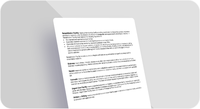 RL-ACC3-CERT2-23-IN 10 D12967 (11/25) Rehabilitation Facility means a free-standing facility providing coordinated multidisciplinary physical restorative services to inpatients under the direction of a Doctor knowledgeable and experienced in rehabilitative medicine. A Rehabilitation Facility must meet all the following requirements: It is licensed and operated pursuant to law. It provides treatment and care for ill and injured persons on an inpatient basis. It provides 24 hours a day service by registered graduate nurses (RNs). It is not an institution or any part used as: a hospice unit, including any bed designated as a hospice or a swing bed; a convalescent home; a rest or nursing facility; or a facility primarily affording custodial, educational care, or care or treatment for persons suffering from mental diseases or disorders, or care for the aged, or drug or alcohol addiction. Rehabilitation Facility includes a unit of a Hospital with beds set up and staffed and specifically designated for rehabilitative medicine. Signed means any symbol or method executed or adopted by a person with the present intention to authenticate a record, which is on or transmitted by paper or electronic or telephonic media, and which is consistent with applicable law. Telehealth means a medical encounter with a Doctor or licensed medical professional via telecommunication and information technologies (including, but not limited to, audio or video communications) for evaluation, diagnosis, or treatment as would be practiced in person. This does not include requests for prescription refills or medical records. Urgent Care Facility means a specified area within a Hospital, or a standalone facility, licensed as an urgent care center with the state, that provides outpatient immediate and semi-urgent healthcare of non-life threatening injuries or illnesses. Urgent Care Facility does not include an Emergency Room as defined. Written or Writing means a record which is on or transmitted by paper or electronic or telephonic media, and which is consistent with applicable law. Sickness means illness, infection, disease or any other abnormal physical condition that is not due to an Injury. Sickness includes pregnancy, infection and any other abnormal physical condition that is not caused by an Accident.