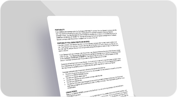 RL-ACC3-SPR2-23-IN 3 SPR-12967 (11/25) PORTABILITY If you continue your coverage under the Certificate’s PORTABILITY provision, then your Spouse’s coverage under this rider may also be continued at the same time. Continued premium payment is required to keep your Spouse’s coverage in force. You may decrease the continued Spouse coverage amount based on the available amounts on the Certificate’s SCHEDULE OF BENEFITS. You may not increase the continued Spouse coverage amount. Continued Spouse coverage under this provision is subject to all the terms of this rider. PORTABILITY FOLLOWING DEATH OR DIVORCE If you die or divorce, your Spouse may elect to continue Spouse coverage under this rider if certain conditions are met. Your Spouse must have been insured under this rider on the date of your death or divorce, your Spouse must be under age 75, and your Spouse must elect portability and pay the first premium within 31 days of the date of your death or divorce. If your Spouse continues coverage under this provision, your Spouse will become the owner of their Spouse coverage under this rider. Your Spouse may decrease the continued Spouse coverage amount based on the amounts available on the Certificate’s SCHEDULE OF BENEFITS. Your Spouse may not increase the continued Spouse coverage amount. Coverage continued under this provision is subject to all the terms of this rider. Premiums will be billed directly to your Spouse. Continued premium payment is required to keep coverage in force. The initial premium will be based on the portability premium rates in effect at the time your Spouse elects portability. We may change the portability premium rates at any time upon 31 days Written notice to your Spouse. Coverage continued under this provision will end on the earliest of the following: The end of the period for which premiums for this rider are paid if the next premium is not paid by its due date, subject to the GRACE PERIOD provision. The date your Spouse attains age 75. The date your Spouse voluntarily cancels coverage under this rider. The date your Spouse dies. The date the Policy terminates because we stop providing accident coverage to all groups in the Policy issue state and coverage for all Covered Persons under the Policy terminates. We will provide 60 days Written notice of termination. GRACE PERIOD Refer to the GRACE PERIOD provision in the Certificate if you are continuing coverage under the Certificate’s PORTABILITY provision. If your Spouse is continuing coverage under the PORTABILITY FOLLOWING DEATH OR DIVORCE provision, your Spouse has a grace period of 60 days for the payment of any premium due. During this grace period, your Spouse’s coverage will remain in force. If the full premium payment is not received by us by the due date, we will give Written notification to your Spouse that if the premium is not paid by the end of the grace period, then all coverage under this rider will terminate on the last day of the grace period. If we fail to give such Written notice, coverage will continue in effect until the date such notice is given. We may extend the grace period by giving Written notice of such intent to your Spouse, and such notice will specify that all coverage will terminate on that date if the premium remains unpaid. A pro rata premium payment is required for any period your Spouse’s coverage was in force during the grace period.