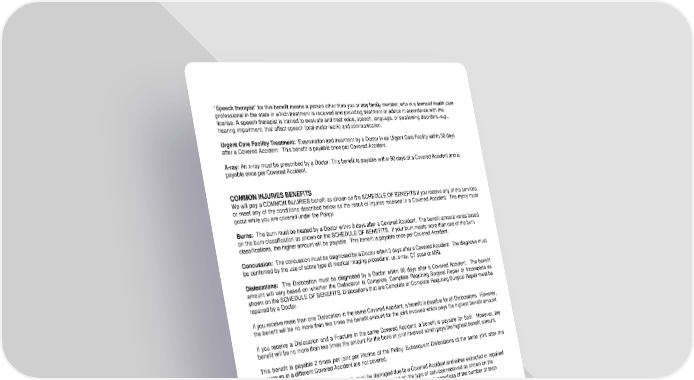 RL-ACC3-CERT2-23-IN 19 D12967 (11/25) “Speech therapist” for this benefit means a person other than you or any family member, who is a licensed health care professional in the state in which treatment is received and providing treatment or advice in accordance with the license. A speech therapist is trained to evaluate and treat voice, speech, language, or swallowing disorders–e.g., hearing impairment, that affect speech (oral-motor-work) and communication. Urgent Care Facility Treatment: Examination and treatment by a Doctor in an Urgent Care Facility within 30 days after a Covered Accident. This benefit is payable once per Covered Accident. X-ray: An x-ray must be prescribed by a Doctor. This benefit is payable within 90 days of a Covered Accident and is payable once per Covered Accident. COMMON INJURIES BENEFITS We will pay a COMMON INJURIES benefit as shown on the SCHEDULE OF BENEFITS if you receive any of the services or meet any of the conditions described below as the result of Injuries received in a Covered Accident. The Injury must occur while you are covered under the Policy. Burns: The burn must be treated by a Doctor within 3 days after a Covered Accident. The benefit amount varies based on the burn classification as shown on the SCHEDULE OF BENEFITS. If your burn meets more than one of the burn classifications, the higher amount will be payable. This benefit is payable once per Covered Accident. Concussion: The concussion must be diagnosed by a Doctor within 3 days after a Covered Accident. The diagnosis must be confirmed by the use of some type of medical imaging procedure; i.e. x-ray, CT scan or MRI. Dislocations: The Dislocation must be diagnosed by a Doctor within 90 days after a Covered Accident. The benefit amount will vary based on whether the Dislocation is Complete, Complete Requiring Surgical Repair or Incomplete as shown on the SCHEDULE OF BENEFITS. Dislocations that are Complete or Complete Requiring Surgical Repair must be repaired by a Doctor. If you receive more than one Dislocation in the same Covered Accident, a benefit is payable for all Dislocations. However, the benefit will be no more than two times the benefit amount for the joint involved which pays the highest benefit amount. If you receive a Dislocation and a Fracture in the same Covered Accident, a benefit is payable for both. However, the benefit will be no more than two times the amount for the bone or joint involved which pays the highest benefit amount. This benefit is payable 2 times per joint per lifetime of the Policy. Subsequent Dislocations of the same joint after this maximum in a different Covered Accident are not covered. Emergency Dental Work: Natural teeth must be damaged due to a Covered Accident and either extracted or repaired by the placement of a crown. The benefit amount varies based on the type of services received as shown on the SCHEDULE OF BENEFITS. This benefit is payable once per Covered Accident regardless of the number of teeth involved. Eye Injury: The eye Injury must be treated by a Doctor within 90 days after a Covered Accident. The Injury must require surgery or the removal of a foreign object by a Doctor. The benefit amount varies based on the type of services received as shown on the SCHEDULE OF BENEFITS. This benefit is payable once per Covered Accident. No benefit is payable for examination with anesthesia or for an Injury to the eyelid which is the moveable fold of skin and muscle that covers the eye. Fractures: The Fracture must be diagnosed by a Doctor within 90 days after a Covered Accident. The Fracture must require treatment by a Doctor. If the Doctor diagnoses the Fracture as a Chip Fracture, the benefit will be reduced to a percentage of what would have been paid for a Non-Surgical Repair Fracture of the same bone. The benefit amount varies based on the type of services received as shown on the SCHEDULE OF BENEFITS. If you receive more than one Fracture in a Covered Accident, a benefit is payable for all Fractures. However, the benefit will be no more than two times the benefit amount listed for the bone which pays the highest benefit amount.