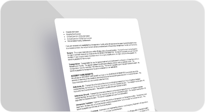 RL-ACC3-CERT2-23-IN 17 D12967 (11/25) Hospital Admission Hospital Confinement Critical Care Unit (CCU) Admission Critical Care Unit (CCU) Confinement Rehabilitation Facility Confinement If you are released and readmitted to a Rehabilitation Facility within 30 days due to the same Covered Accident or due to a related condition, the re-Confinement will be considered part of the previous Rehabilitation Facility Confinement(s). Surgery: The surgery must take place within 30 days after a Covered Accident. The benefit amount varies based on the type of services received as shown on the SCHEDULE OF BENEFITS. This benefit is payable once per Covered Accident. If your surgery meets more than one of the surgery classifications, the higher amount will be payable. No benefit is payable for hernia repair. Transportation: Transportation for you for special treatment and Confinement in a Hospital or Critical Care Unit or a Rehabilitation Facility. The special treatment must be prescribed by a Doctor and not available locally. The transportation must be more than 100 miles one way. This benefit is payable up to 3 trips per Covered Accident. No benefit is payable for transportation by ground ambulance or air ambulance. ACCIDENT CARE BENEFITS We will pay an ACCIDENT CARE benefit as shown on the SCHEDULE OF BENEFITS if you receive any of the services or meet any of the conditions described below as the result of Injuries received in a Covered Accident. The Injury must occur while you are covered under the Policy. Ambulance, Air: Transport by a licensed professional air ambulance company to or from a Hospital or between medical facilities, for treatment of Injuries received as the result of a Covered Accident. The transport must be within 48 hours after the Covered Accident. This benefit is payable once per Covered Accident. Ambulance, Ground: Transport by a licensed professional ambulance company to or from a Hospital or between medical facilities, for treatment of Injuries received as the result of a Covered Accident. The transport must be within 90 days after the Covered Accident. This benefit is payable once per Covered Accident. Chiropractic Treatment: Treatment must be received by a Chiropractor in a Chiropractor's office. The treatment must begin within 90 days after a Covered Accident and be completed within 12 months after the Covered Accident. This benefit is payable up to 6 times per Covered Accident. Emergency Room Treatment: Examination and treatment by a Doctor in an Emergency Room within 30 days after a Covered Accident. This benefit is payable once per Covered Accident. Follow-Up Doctor Treatment: Follow-up treatment by a Doctor must begin within 60 days after a Covered Accident and be completed within 12 months after the Covered Accident. This benefit is only available if you are eligible for the Initial Doctor Visit benefit or the Emergency Room treatment benefit or the Urgent Care Facility treatment benefit. Follow-up treatment may be provided by a Doctor via Telehealth. This benefit is payable up to 6 times per Covered Accident. Initial Doctor Visit: Examination and treatment by a Doctor within 30 days after a Covered Accident. Examination and treatment does not include care by Chiropractor. Examination and treatment may be provided by a Doctor via Telehealth. This benefit is payable once per Covered Accident. Major Diagnostic Exams: A major diagnostic exam must be prescribed by a Doctor and must occur within 6 months after the Covered Accident. This benefit is payable once per Covered Accident.